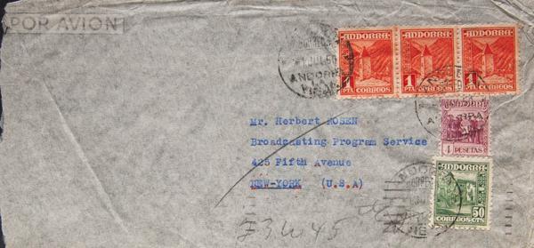 51, 54(3), 42. 1950. 50 green cts, 1 vermilion sts, three stamps and 4 carmine sts. ANDORRA THE OLD to NEW YORK (USA). On the back arrival. MAGNIFICENT AND RARE.