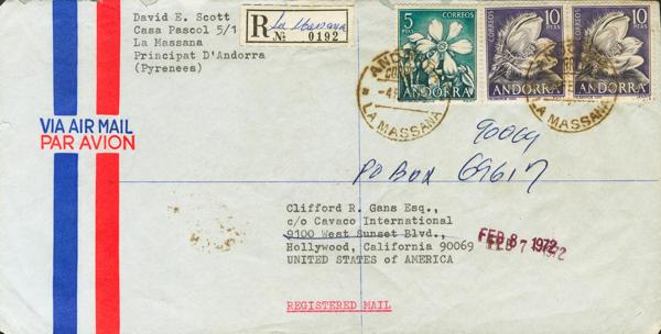 70, 71(2). 1972. 5 pts green and gray and 10 pts violet and slate, two stamps. Registered from LA MASSANA to HOLLYWOOD (USA). Arrival date on the back. MAGNIFICENT.