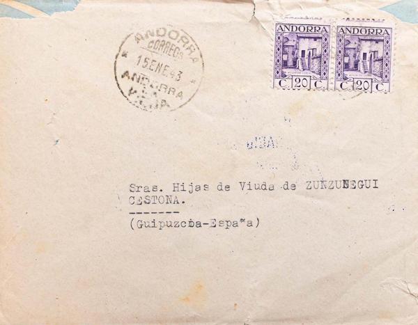 983, 916, 966. 1944. 5 blue pts and various values, including a chestnut 2-ct stamp from Andorra. Certificate from MADRID to BARCELONA. On the back, mark HAS BEEN READ IN THE CORRES / PONDIENTES DELIVERY AND WAS NOT / ANSWERED BY THE MAILERS, in violet and various signatures. MAGNIFICENT AND UNUSUAL.