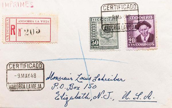 |ENVELOPE| 48, 59(2). 1951. 20 cts lilac and 1 pts violet, two stamps. Certificate from ANDORRA LA VIEJA to NEW YORK (USA). Arrival on the back. MAGNIFICENT.