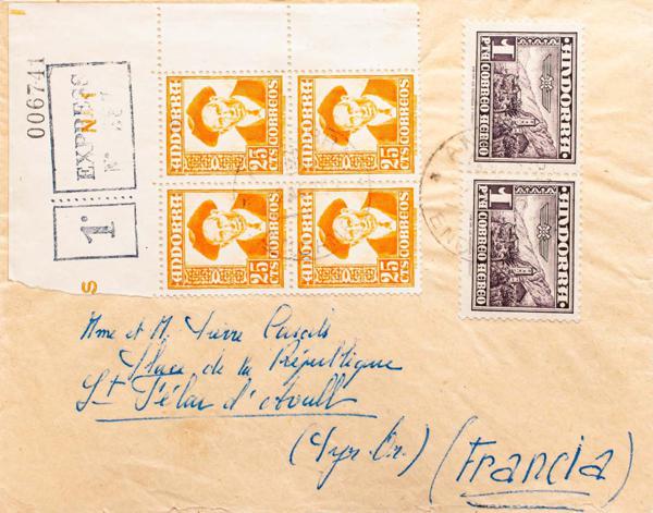 38, 40, 44, 50/55. 1948. Various values. Urgent Certified Letter from ANDORRA LA VIEJA to LUNEL (FRANCE). On the back arrival. MAGNIFICENT AND RARE POSTAGE OF TWO DIFFERENT ISSUES.