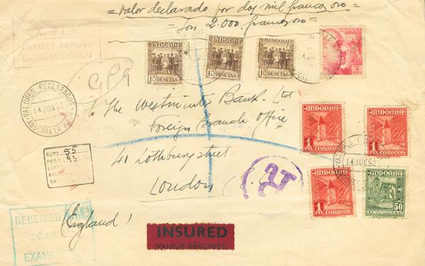 51, 54(3), 43(3). 1952. 50 cts green, 1 pts red, three stamps, 10 pts brown from 1935, three stamps and 4 pts pink from Spain. Declared values from ANDORRA LA VIEJA to LONDON (GREAT BRITAIN). Arrival on the back. MAGNIFICENT, SPECTACULAR AND RARE POSTAGE.