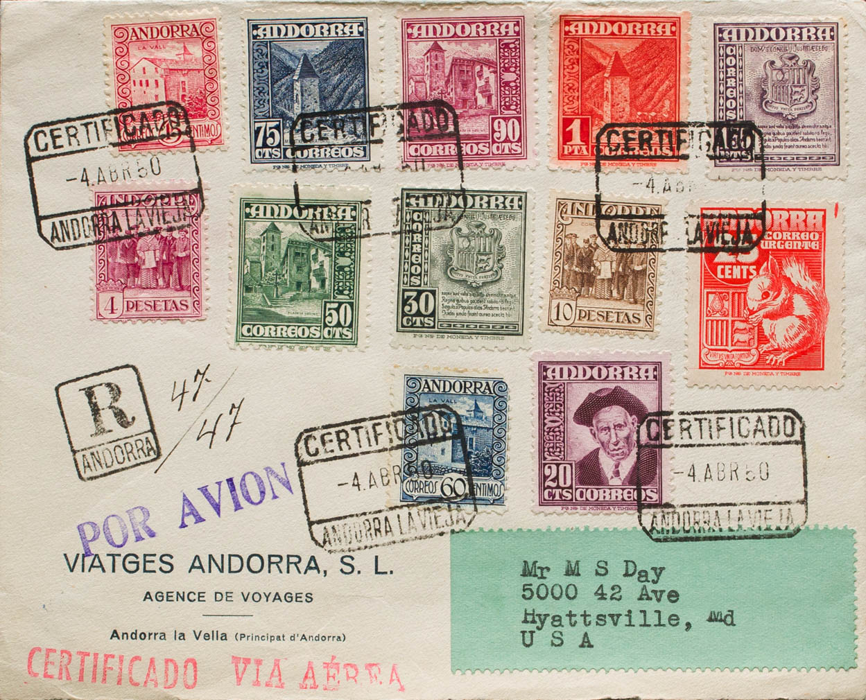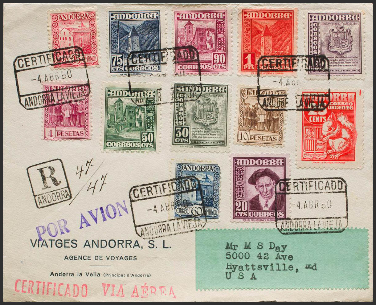 48, 50/55, 40, 42/43. 1950. 4 carmine pts, 10 brown pts and different values. Certificate from ANDORRA LA VIEJA to HYATSVILLE (USA). On the back arrival. MAGNIFICENT AND SPECTACULAR POSTAGE.