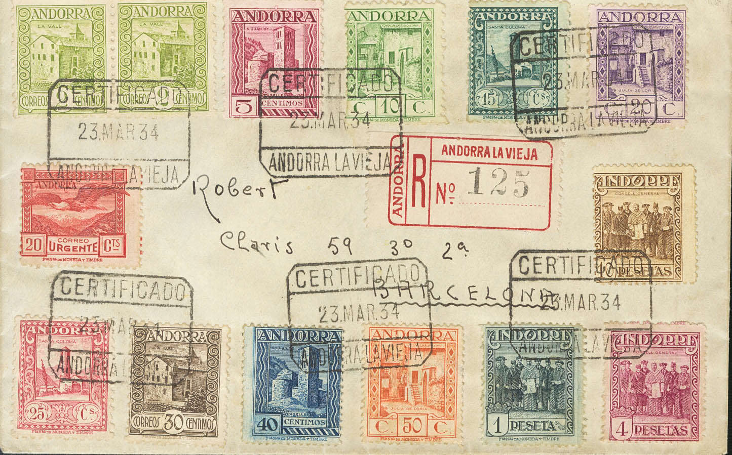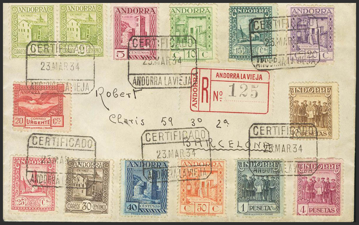 15/27. 1929. Complete series. Certificate from ANDORRA LA VIEJA to BARCELONA. On the back arrival. MAGNIFICENT AND VERY RARE, TRULY CIRCULATED AND SPECTACULAR.