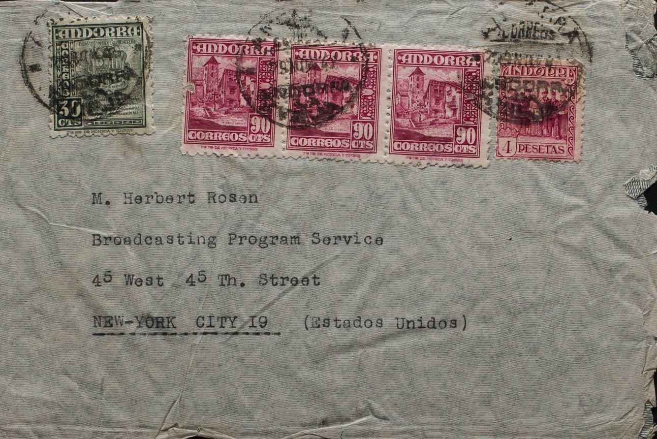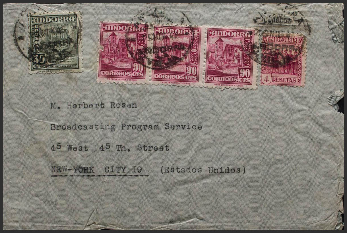 50, 53(3), 42. 1948. Olive green 30 cts, lilac 90 cts, three stamps and 4 carmine pts. ANDORRA THE OLD to NEW YORK (USA). PRETTY.