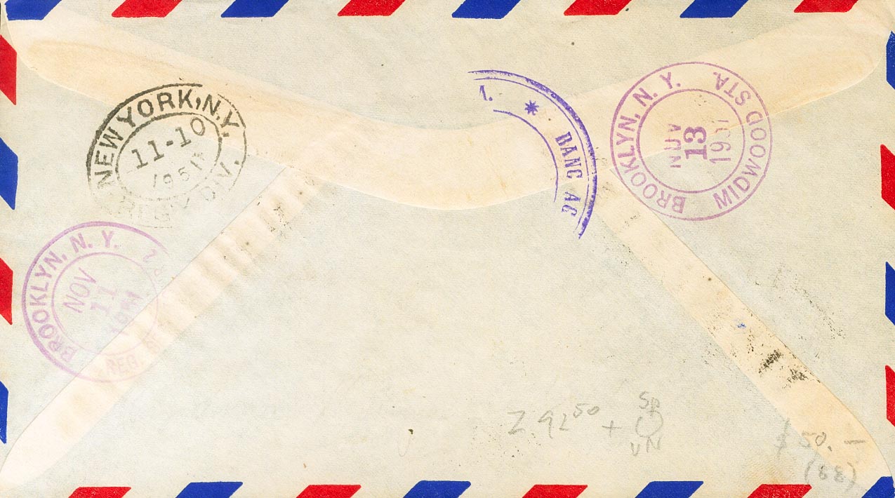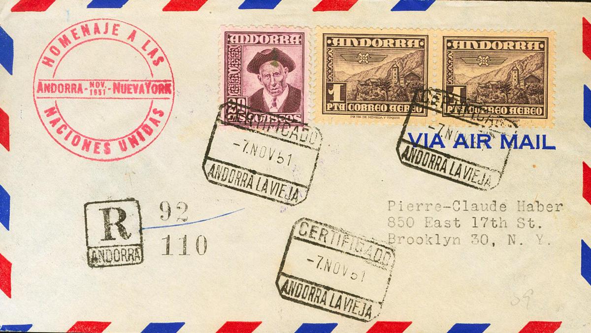 |ENVELOPE| 48, 59(2). 1951. 20 cts lilac and 1 pts violet, two stamps. Certificate from ANDORRA LA VIEJA to NEW YORK (USA). Arrival on the back. MAGNIFICENT.