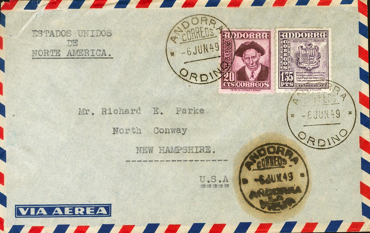 |ENVELOPE| 48, 55. 1949. 20 cts lilac and 1´35 pts violet. ORDERED from NEW HAMPSHIRE (USA). Arrival on the back. MAGNIFICENT AND RARE.