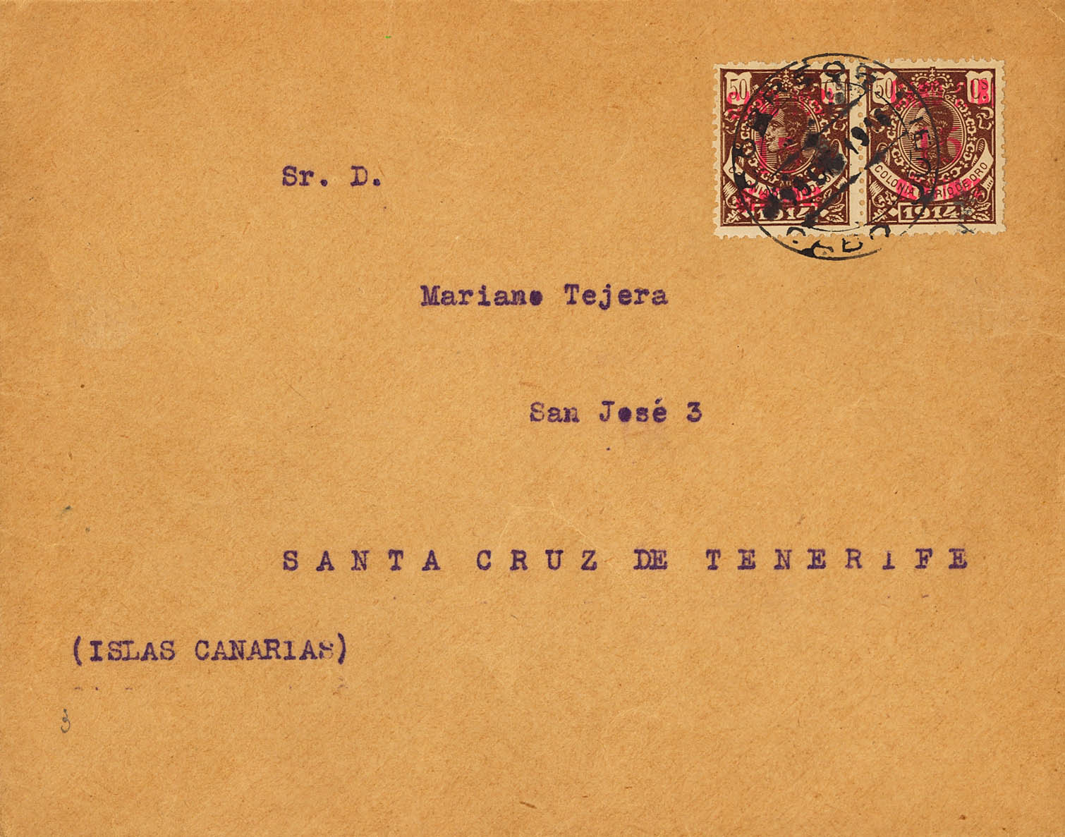 English 3(2). 1916. 15 cts over 50 chestnut cts, two stamps. Philatelic Letter from CABO JUBY to SANTA CRUZ DE TENERIFE. On the back arrival. MAGNIFICENT.