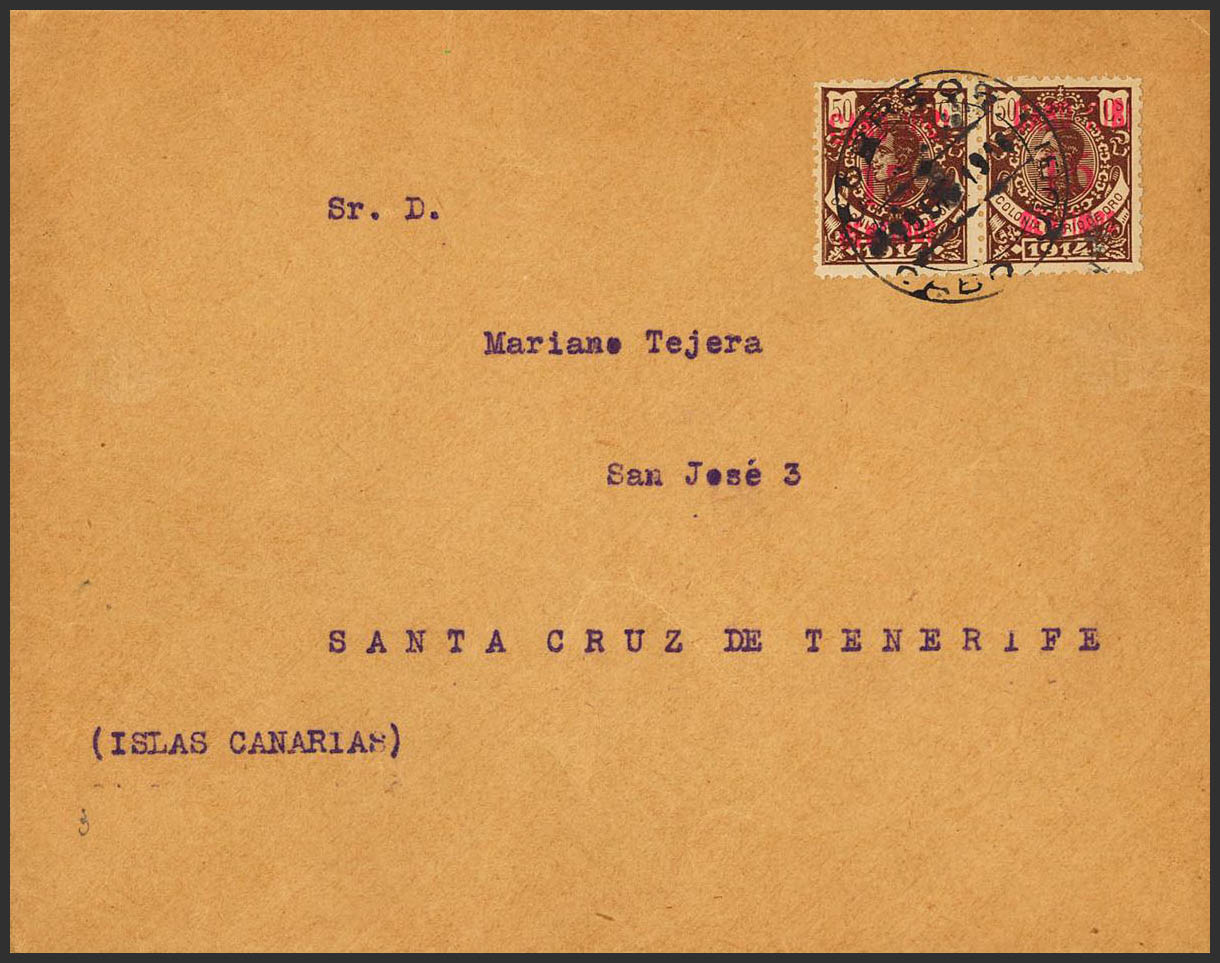 3(2). 1916. 15 cts over 50 chestnut cts, two stamps. Philatelic Letter from CABO JUBY to SANTA CRUZ DE TENERIFE. On the back arrival. MAGNIFICENT.