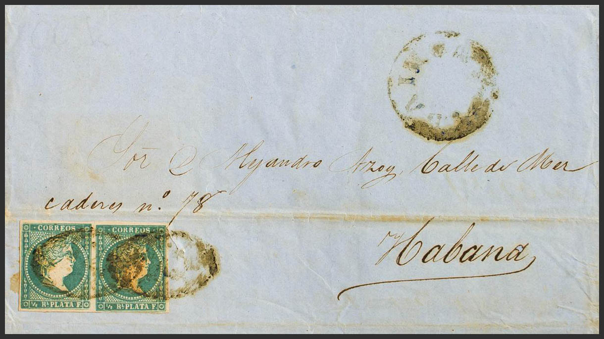Ant.7(2). 1858. ½ real blue, pair. BAINOA to HAVANA. On the front pre-philatelic mark BAINOA, in black. MAGNIFICENT AND EXTREMELY RARE, VERY FEW KNOWN CARDS WITH SEAL AND THIS MARK, PROBABLY NO MORE THAN THREE OR FOUR.