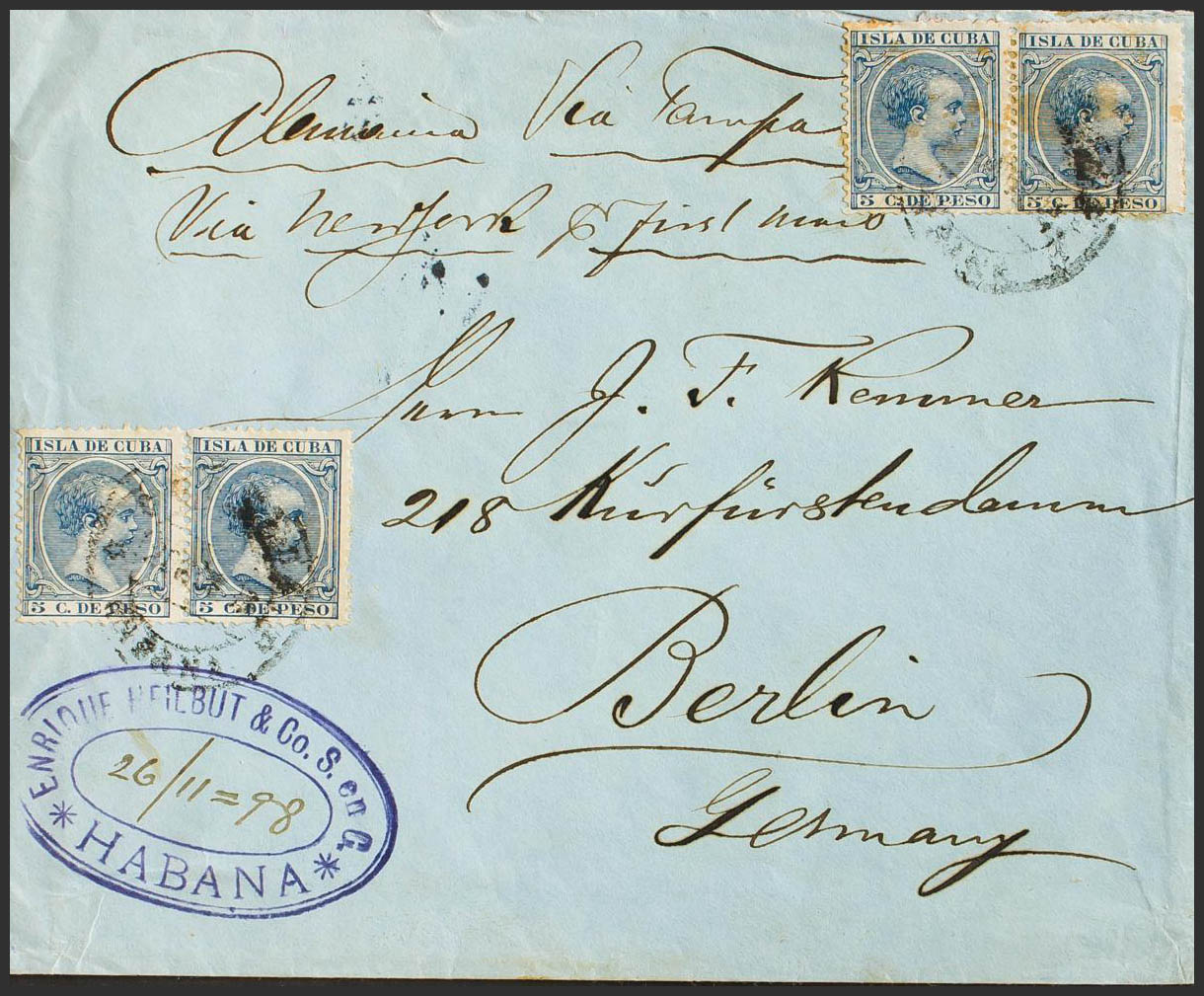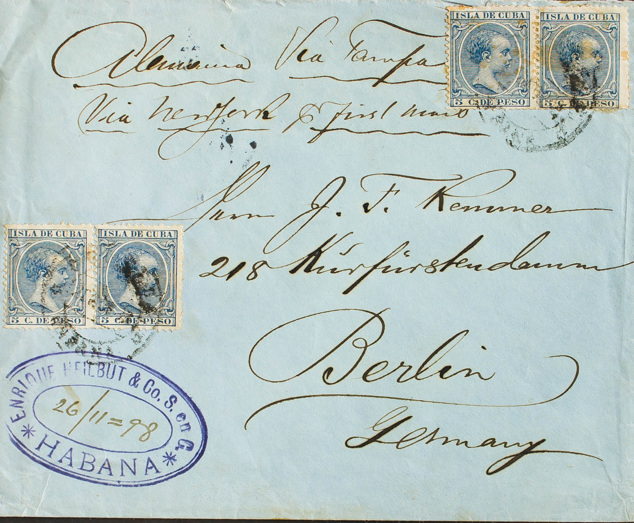 149(4). 1898. Blue 5 cents, two pairs. HAVANA to BERLIN (GERMANY). On the back arrival. MAGNIFICENT AND VERY RARE DOUBLE POSTAGE POSTAGE.