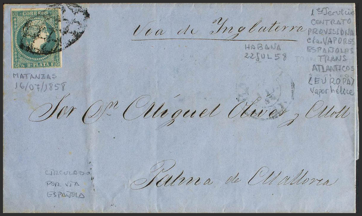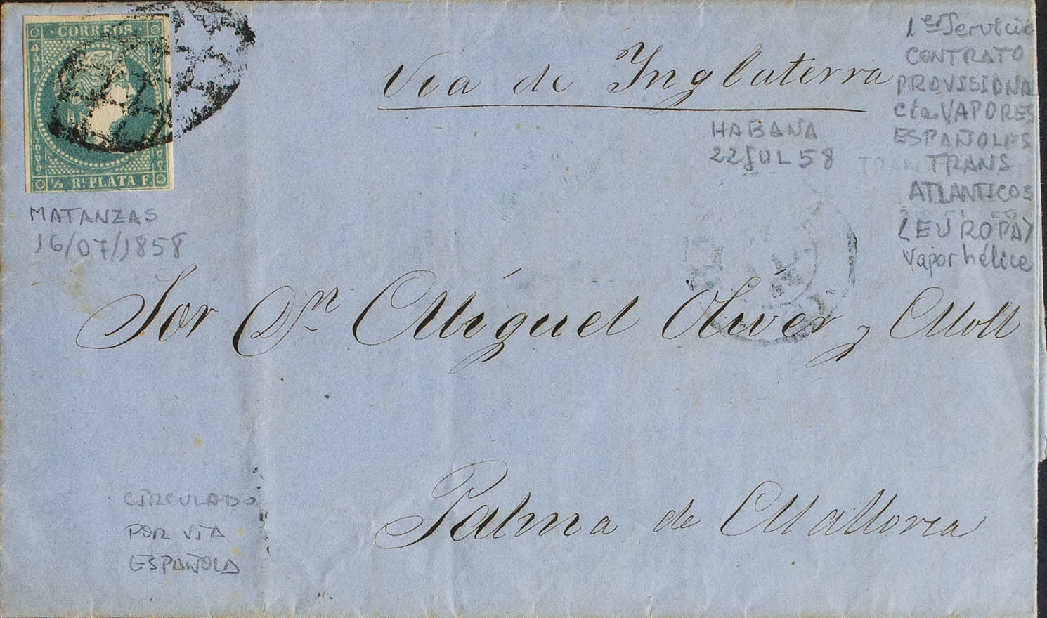 Ant.7. 1858. ½ real blue. HAVANA to PALMA DE MALLORCA, circulated by the Spanish route (although on the front it indicates VÃa de Ynglaterra) in the steamship "Europa" and in the first service of the CompañÃa de Vapores Españoles Transatlánticos, precisely for this reason and because of the novelty and ignorance of the service an erroneous line was registered. MAGNIFICENT AND RARE.