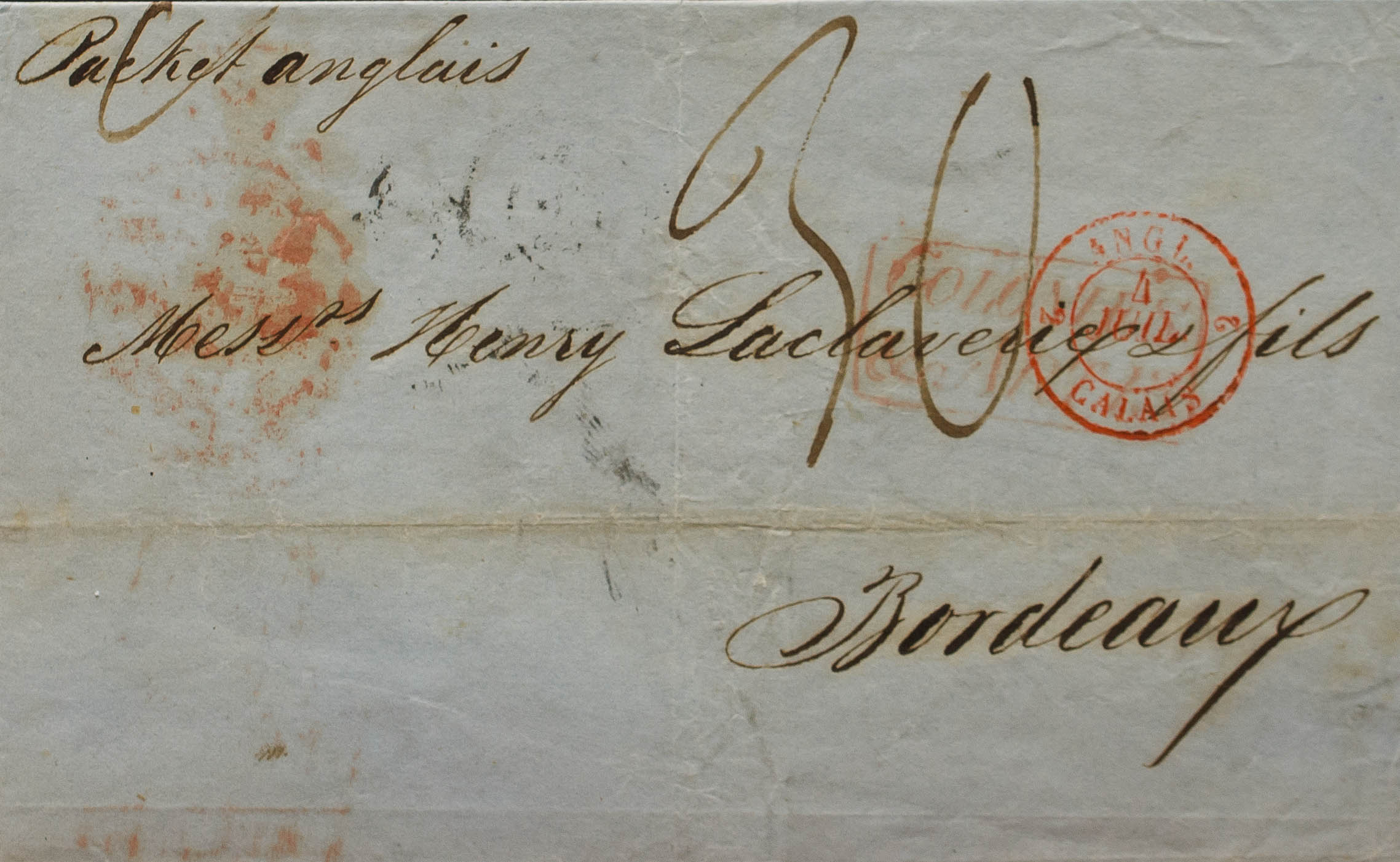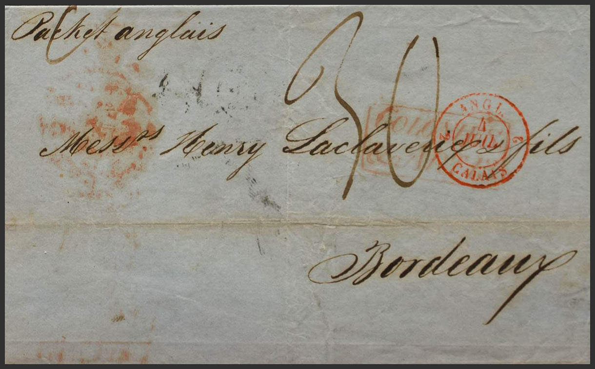 1850. SANTIAGO DE CUBA to BORDEAUX (FRANCE). COLONIES / AND C.ART.13 mark and French porterage "30", ST.JAGO DE CUBA dater on the back, from the British Postal Agency (PE19) 2004 edition. MAGNIFICENT AND RARE.