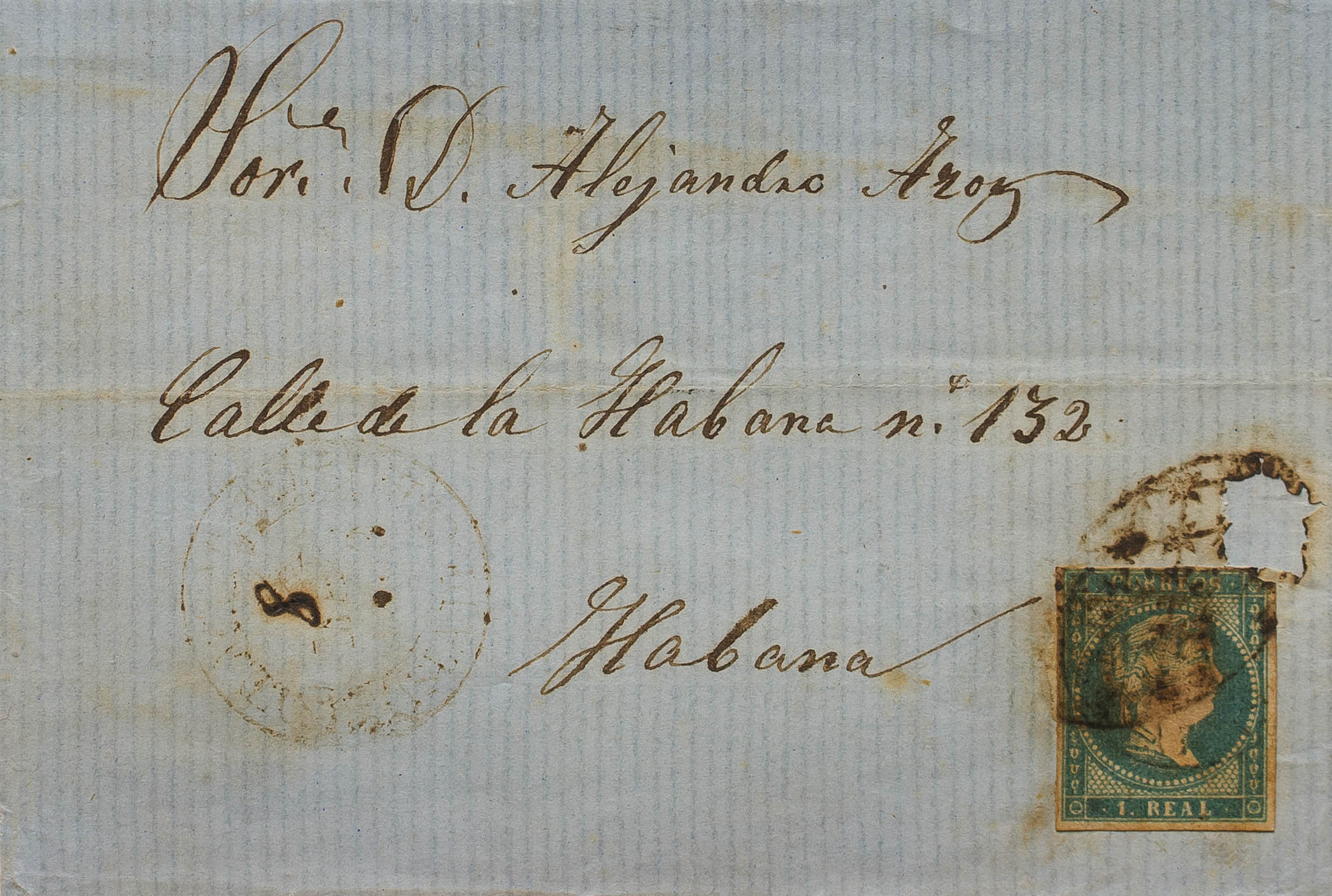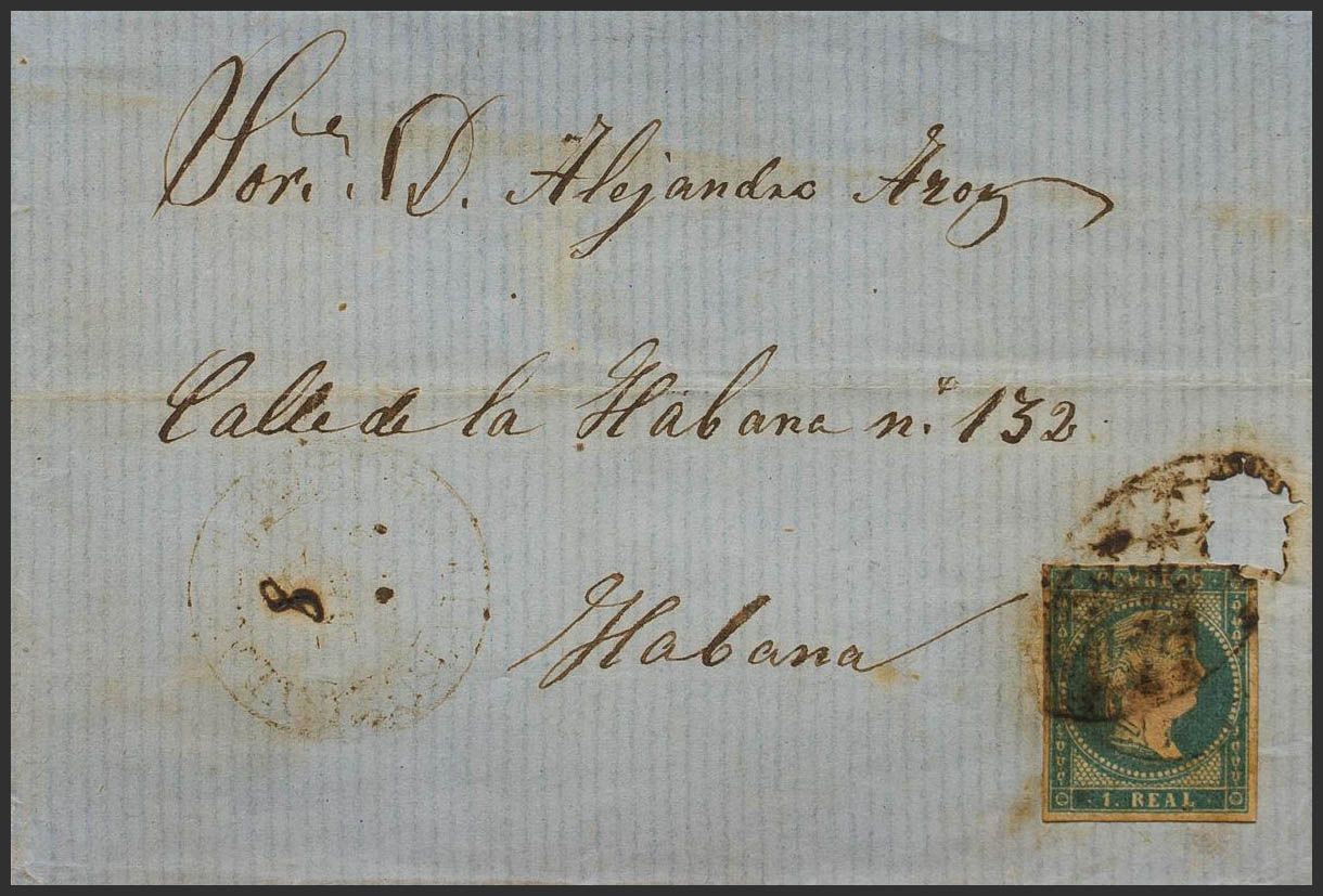 1859. 1 greenish blue real from Spain. SAN ISIDRO DE AVOCADO (MEXICO) to HAVANA. COLONIAL GRILL postmark (eroded at the top), the stamp was most likely reused without being noticed by the mail. MAGNIFICENT AND VERY RARE USE OF A STAMP FROM SPAIN IN THE AMERICAS, PROBABLY THE ONLY KNOWN WITH THIS CIRCUMSTANCE. Certificate COMEX.