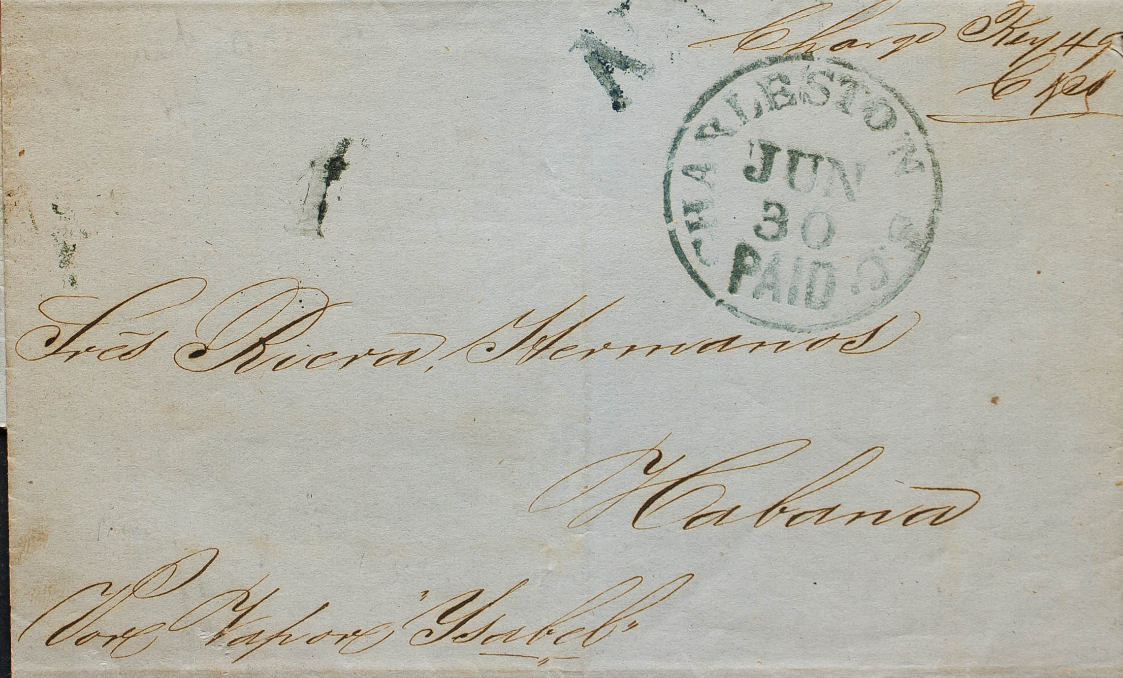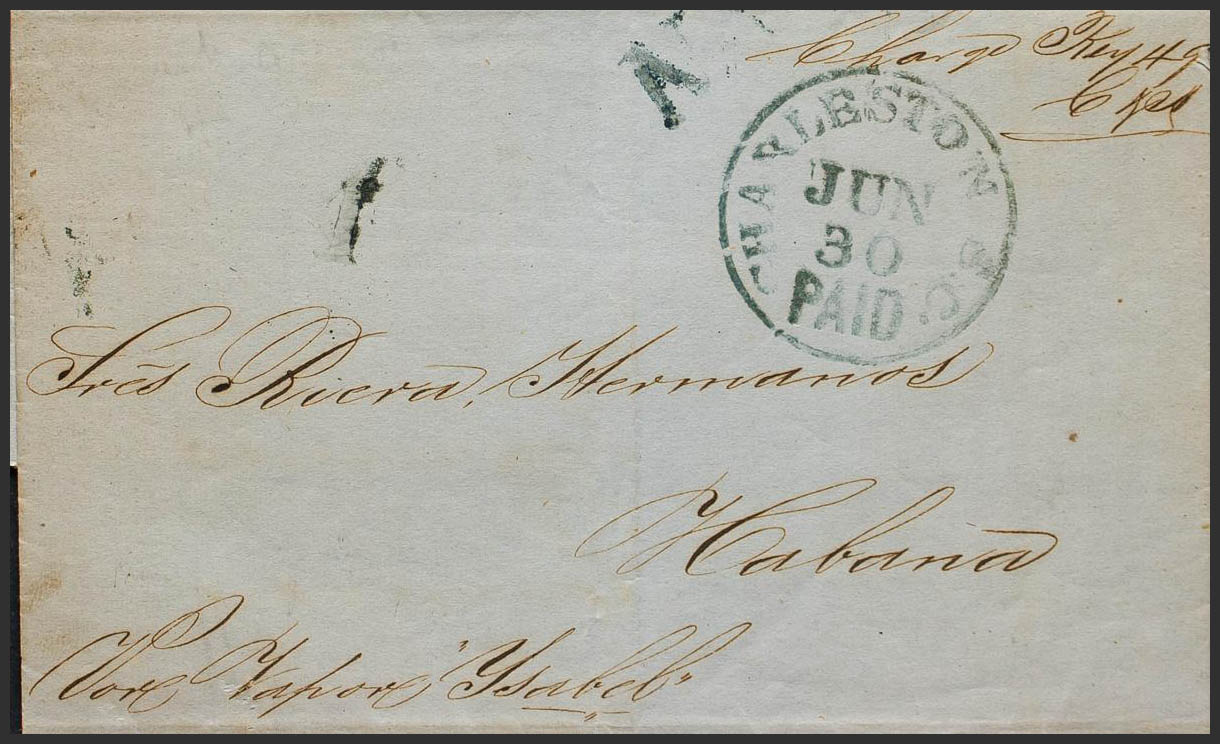 1853. CHARLESTON (USA) to HAVANA. CHARLESTON / PAID dater, in blue, NA mark, in the same color and "By Vapor Ysabel" handwriting. MAGNIFICENT AND RARE.