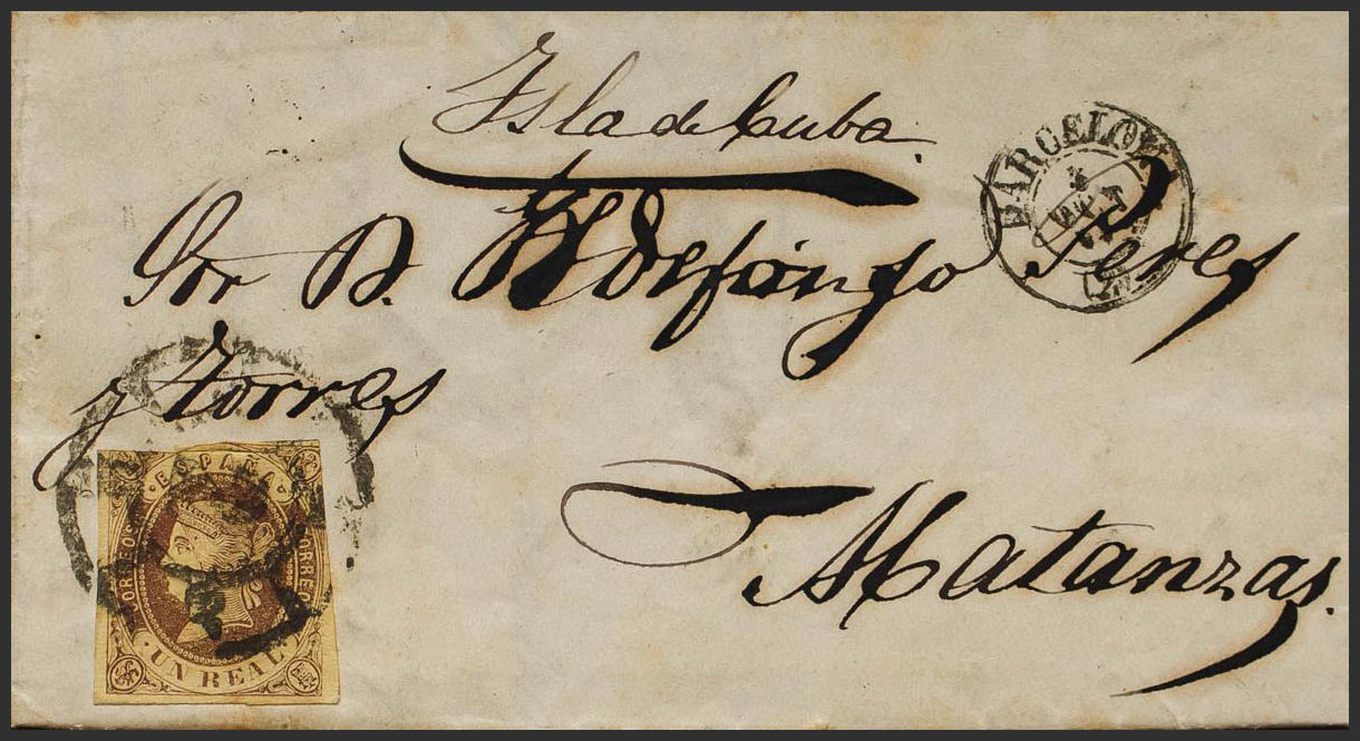 English 61. 1862. 1 real chestnut. BARCELONA to MATANZAS. Postmark R. CARRETA Nº2. MAGNIFICENT AND UNUSUAL DESTINATION.