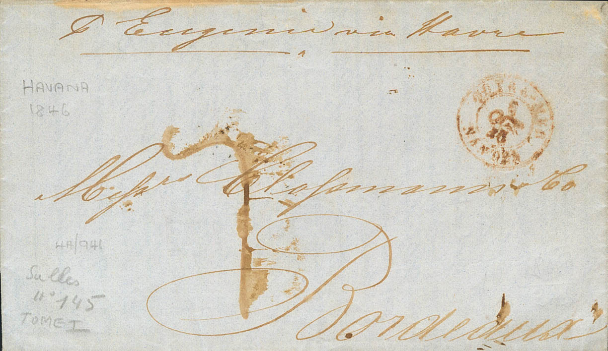 English 1846. HAVANA to BORDEAUX (FRANCE). OUTRE-MER / NANTES dater, in red, handwritten "By Eugenia via Havre" and porterage 7. MAGNIFICENT.