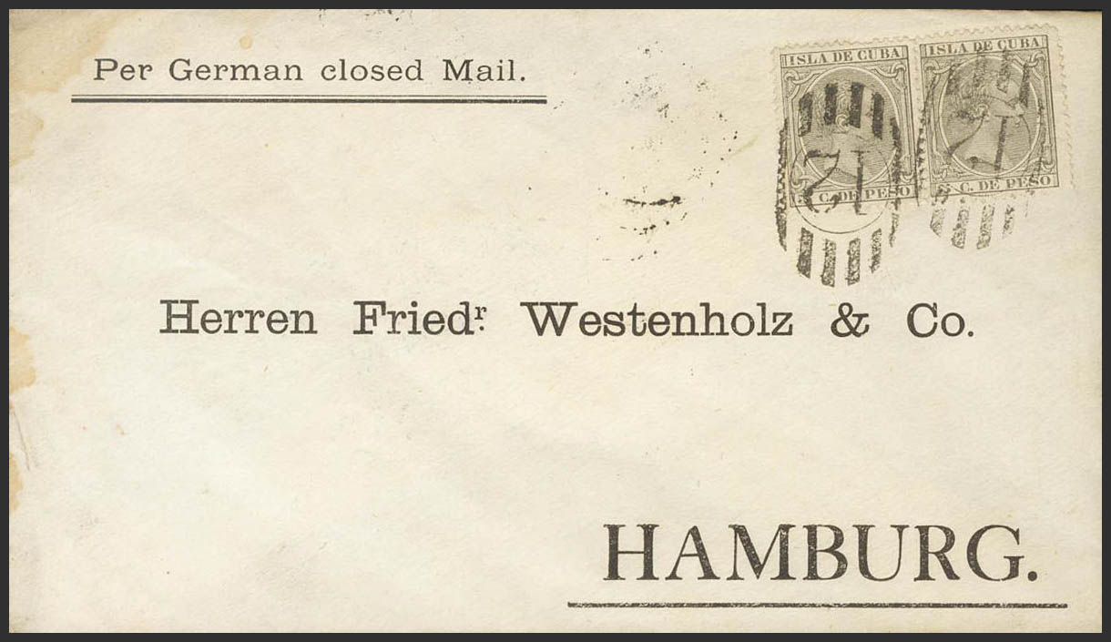 115(2). 1890. 5 gray green cents, two stamps. HAVANA to HAMBURG. Postmark GRILL WITH Nº12 and on the back FOREIGN NY TRANSIT transit and arrival. MAGNIFICENT.