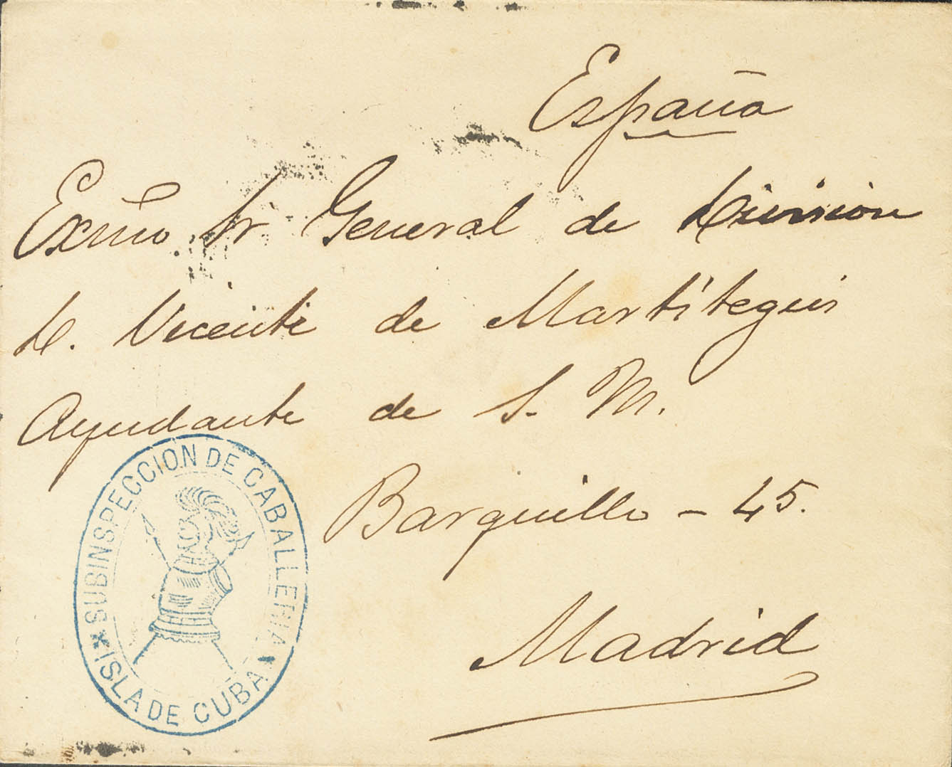 1896. Addressed to MADRID. Franchise brand SUBINSPECTION OF CABALLERIA / ISLAND OF CUBA, in blue and arrival on the back. MAGNIFICENT AND RARE.