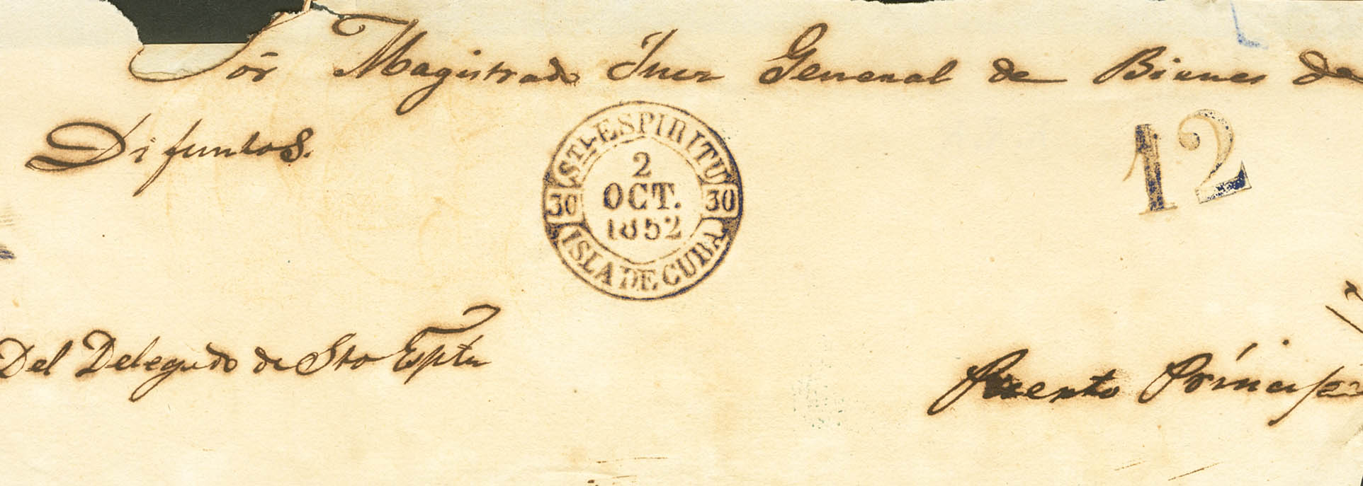 |ABOUT|1852. SANCTI SPIRITUS to PUERTO PRINCIPE (ink erosion at the top). Baeza STI.ESPIRITU / ISLA DE CUBA, in blue. BEAUTIFUL AND SPECTACULAR PRINTING.