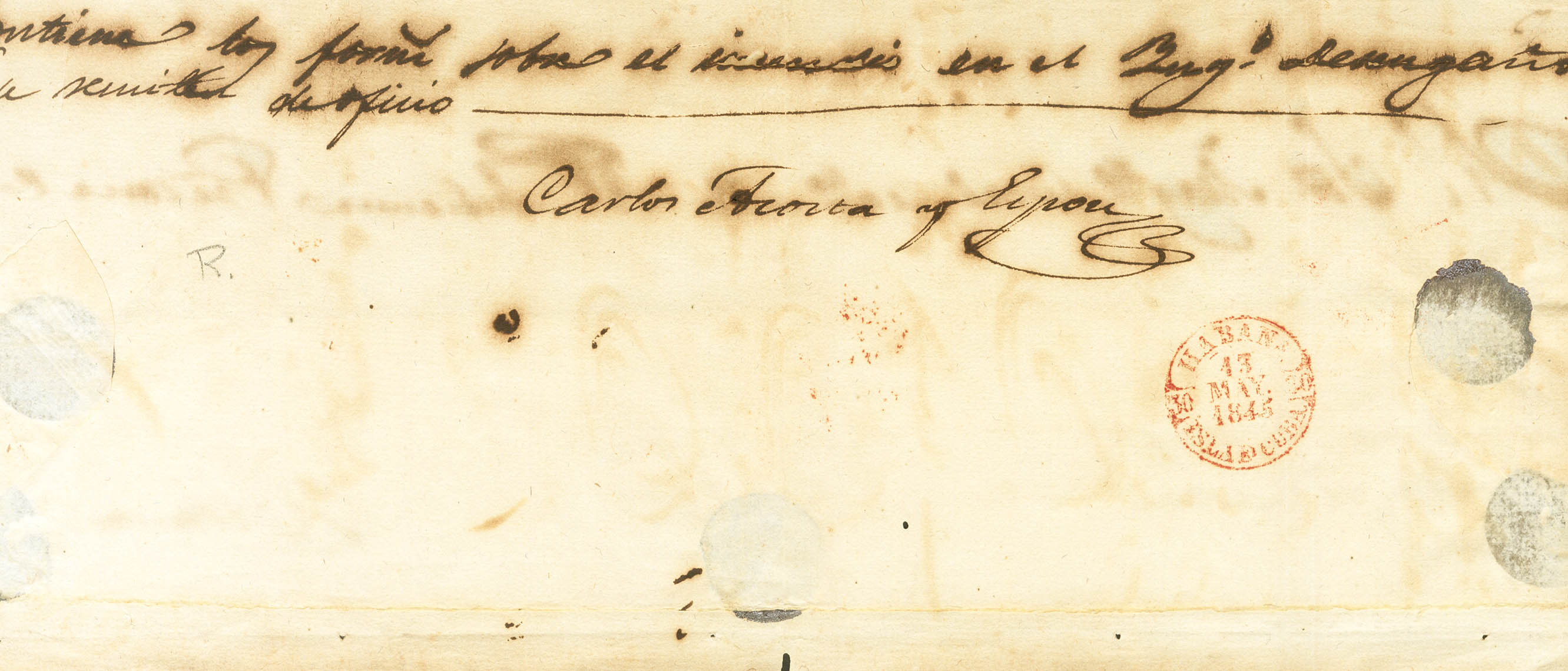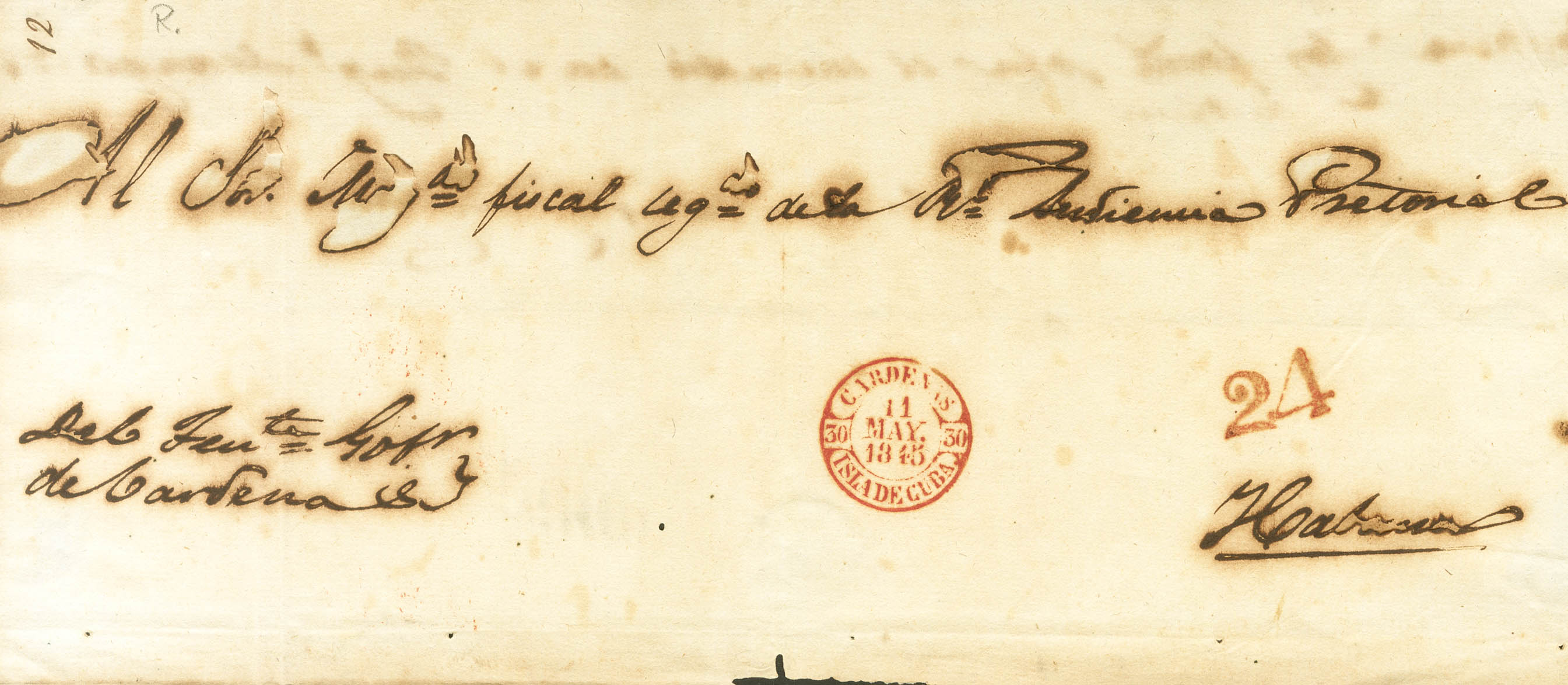 |ABOUT|1845. Judicial Escrow of CARDENAS to HAVANA. Baeza CARDENAS / ISLAND OF CUBA, in red. MAGNIFICENT PRINTING.