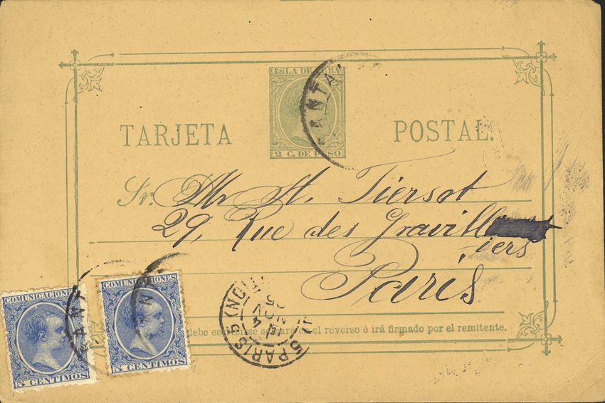 EP25. 1895. 2 cts green stationery cover from Cuba from SANTANDER to PARIS with complementary postage of 5 cts blue, two stamps. MAGNIFICENT AND RARE WHOLE OF CUBA, CIRCULATED FROM THE PENINSULA.