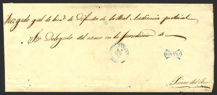 1855. Judicial Escrow from HAVANA to PINAR DEL RIO. Baeza HAVANA / ISLAND OF CUBA, in blue (PE14) and FRANCO brand, in blue (PE19) 2004 edition. MAGNIFICENT.