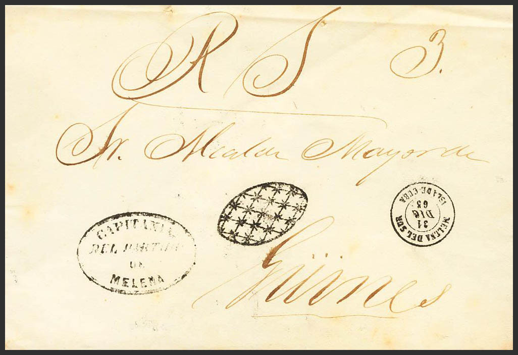 1865. MELENA to GÜINES. Mark CAPITANIA / DEL PARTIDO / DE / MELENA and COLONIAL GRILL, indicating that the letter circulated postage-free. MAGNIFICENT AND RARE.