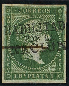 20D. 1868. 1 real green. FEATHER STRIPE postmark. MAGNIFICENT. Edifil 2012: 275 Euros