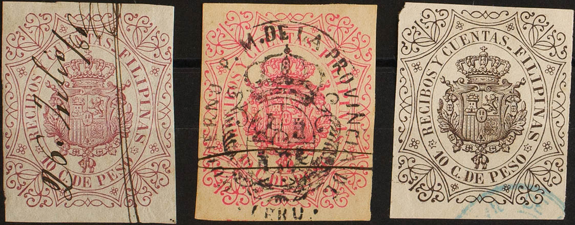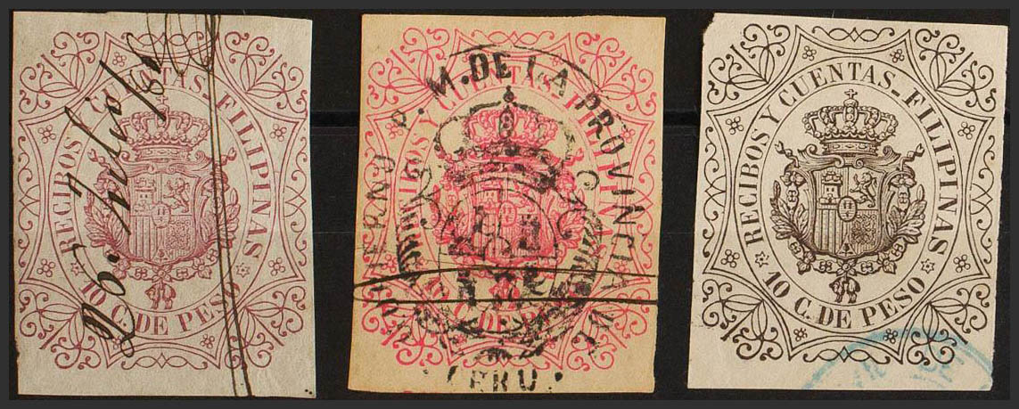 English 1879. RECEIPTS AND ACCOUNTS of 1879. 10 cents pink, 10 cents carmine pink and 10 cents red chestnut. MAGNIFICENT. (Forbin 1/2, 3)