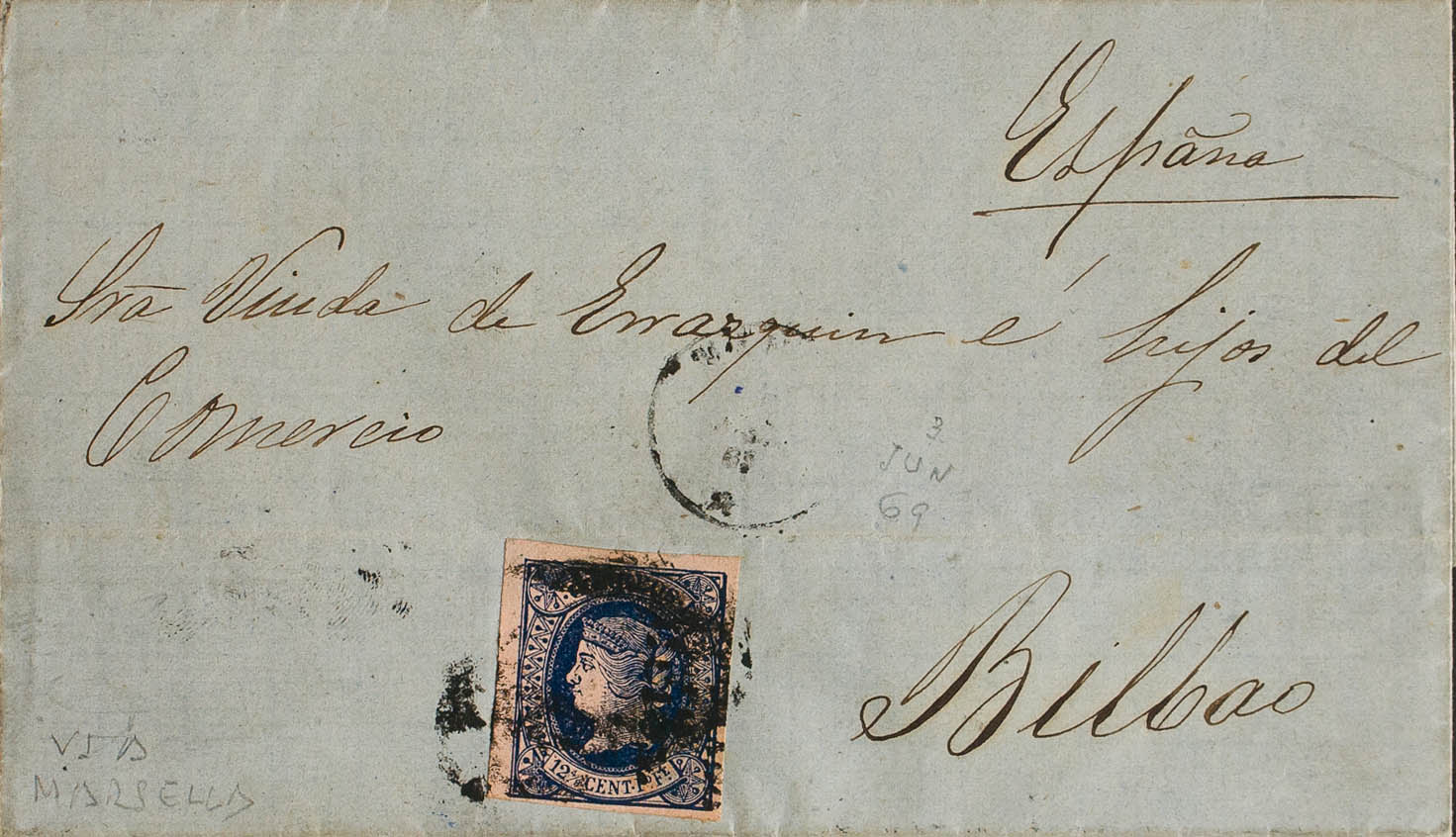 200. 1869. 12 4/8 cents blue ENABLED BY THE NATION. MANILA to BILBAO, circulated via Marsella. MAGNIFICENT AND VERY RARE.