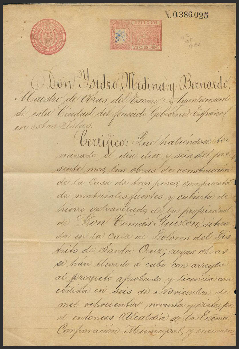 1899. 25 cents carmine pink SEALED PAPER, on MANILA Construction Recognition document, INTERNAL REVENUE qualification, in blue. MAGNIFICENT AND RARE.