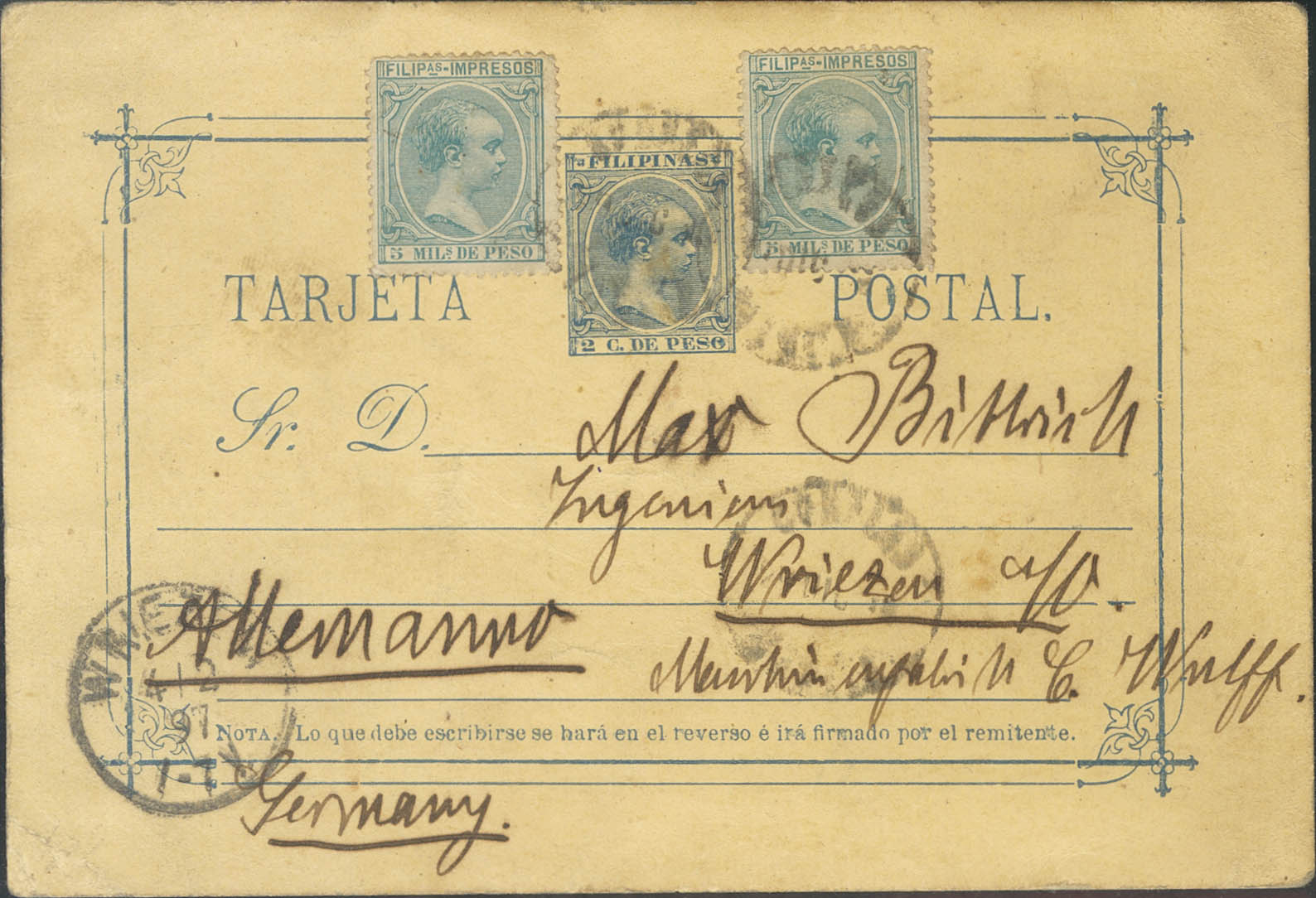 EP10, 119(2). 1897. 2 cts blue on Postal Card from MANILA to GERMANY, with complementary postage of 5 cts green, two stamps. MAGNIFICENT AND VERY RARE, TRULY CIRCULATED.