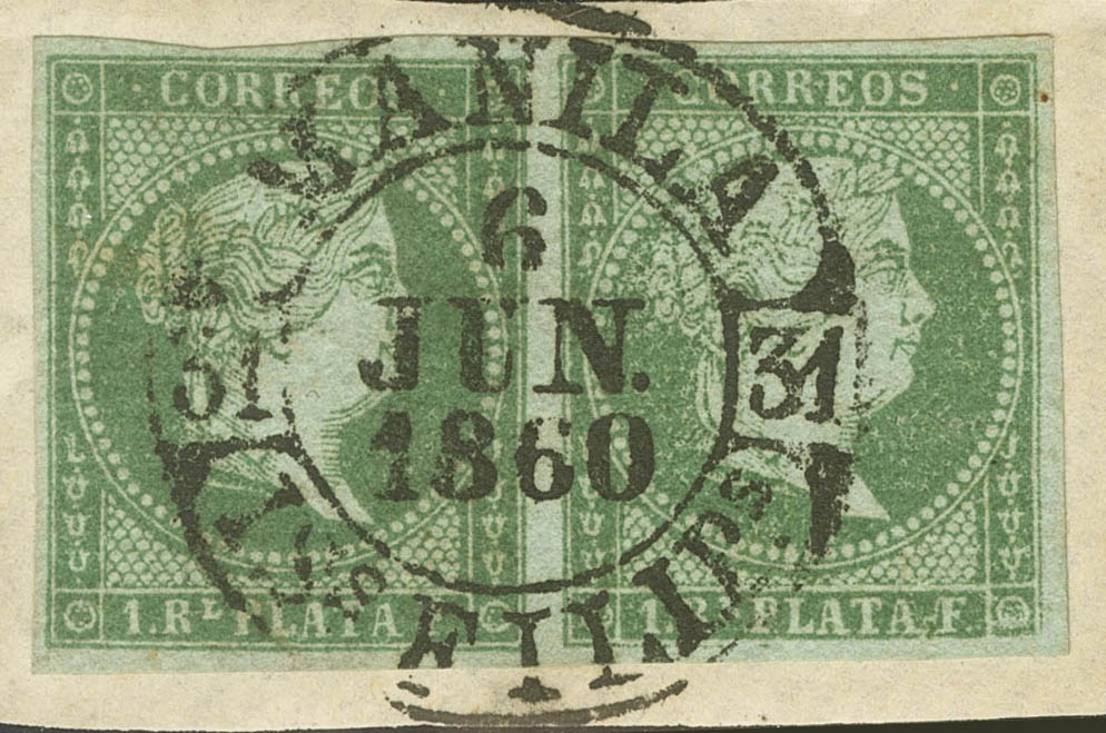 |fragment| 6a(2). 1856. 1 real green of the Antilles, pair. Baeza postmark MANILA / ISS. PHILIPS., in black. MAGNIFICENT PRINTING.