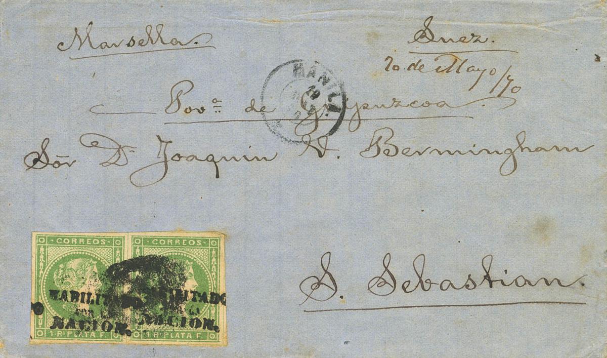 |ENVELOPE| 20L(2). 1869. 1 real green, pair. MANILA to SAN SEBASTIAN. MAGNIFICENT AND VERY RARE. Cert. COMEX.