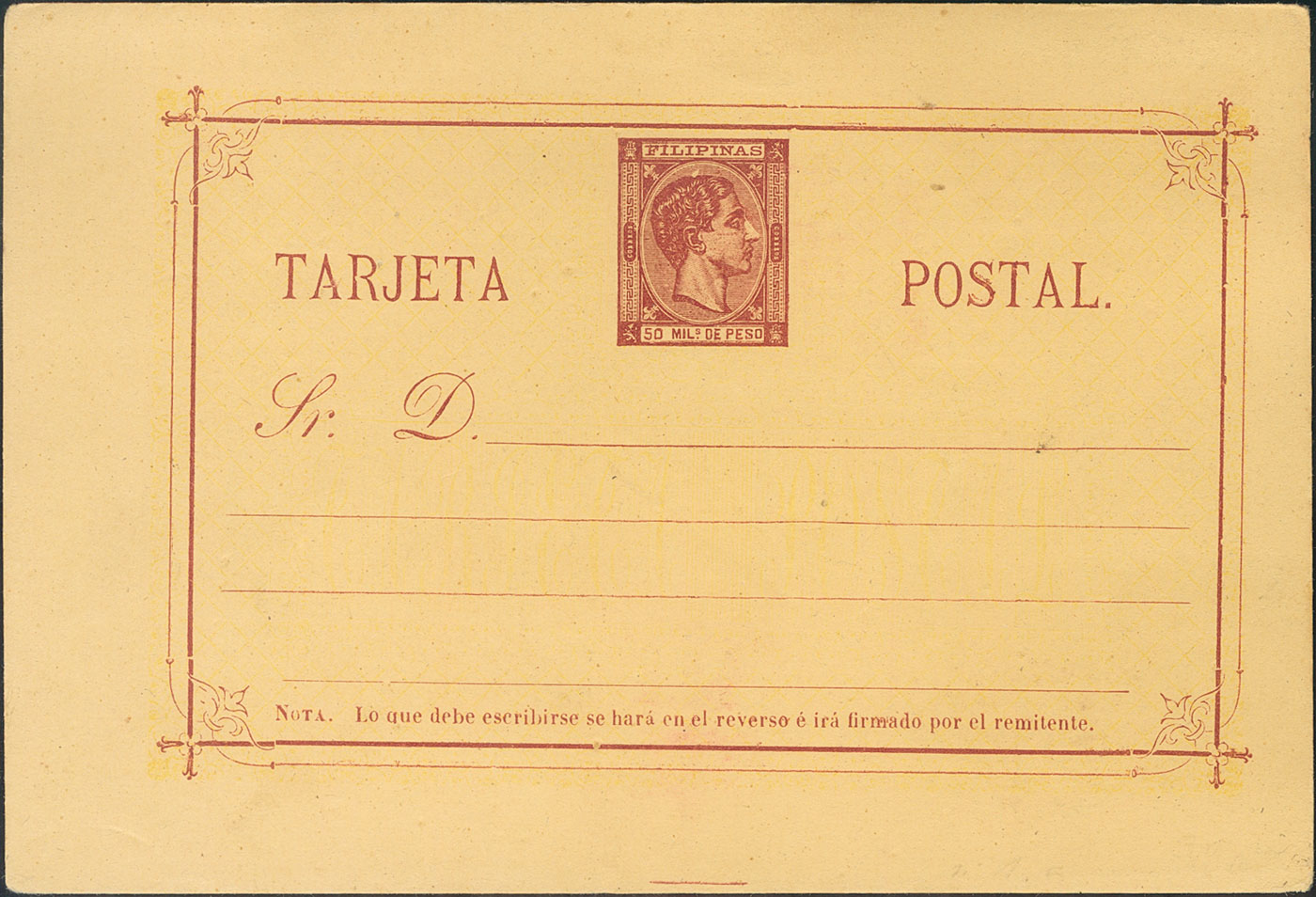 (★) EP1. 1878. 50 mils red chestnut on Entire Post Card. MAGNIFICENT AND EXTRAORDINARILY RARE, AT THE MOST A DOZEN PIECES ARE KNOWN, MOST OF THEM WITH THE MARGINS CROPPED. Edifil 2021: 3,360 Euros