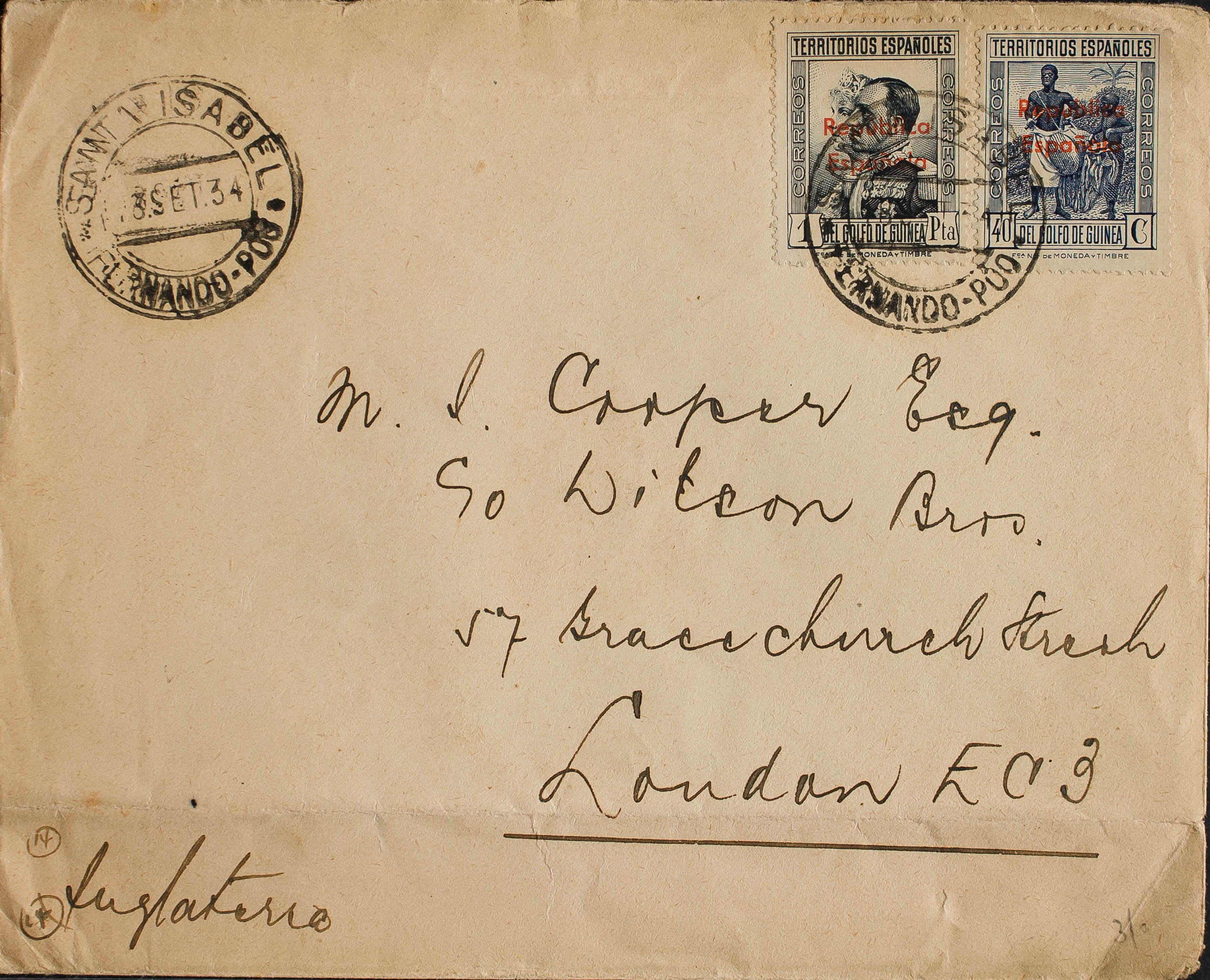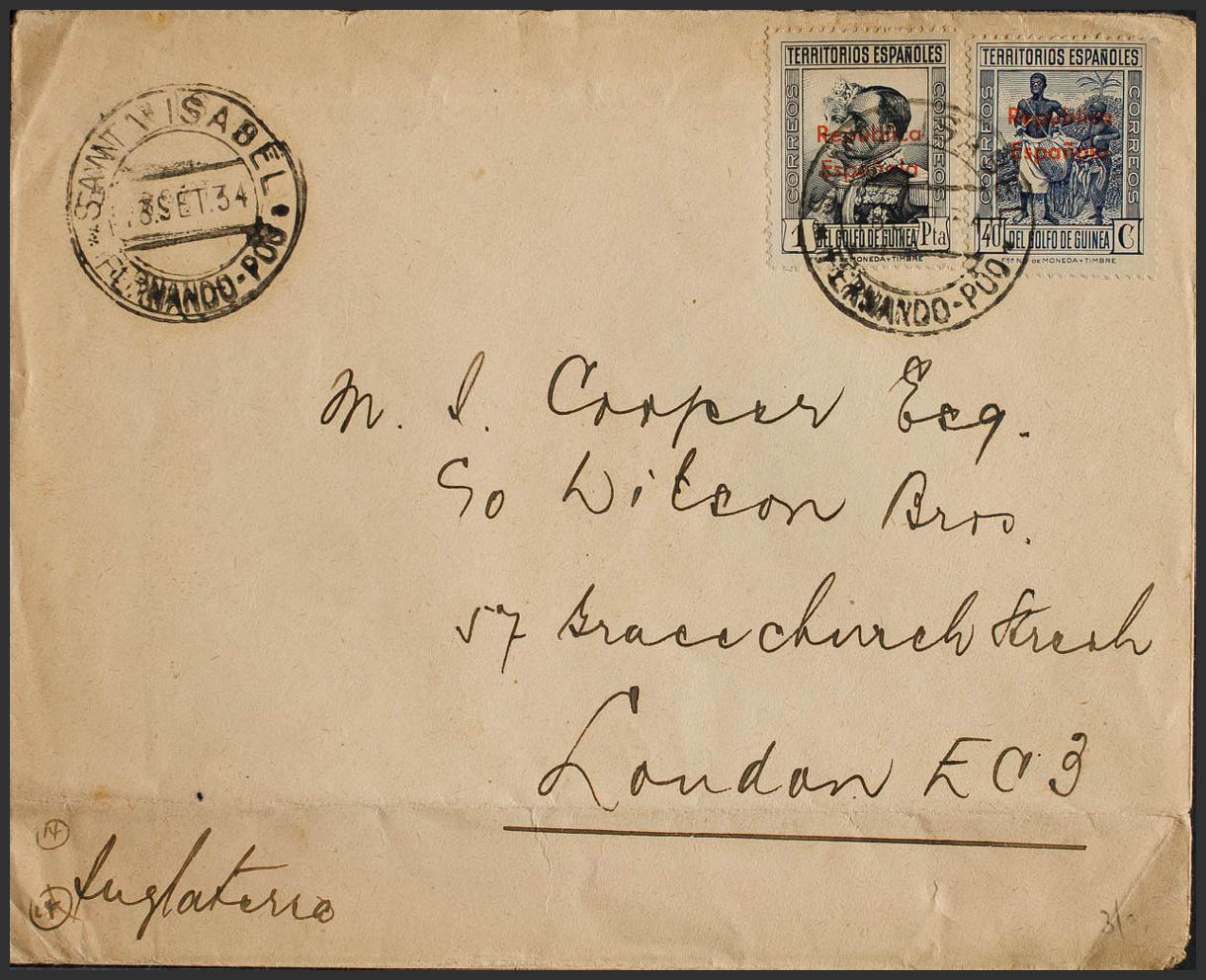 238, 241. 1934. 40 blue cts and 1 slate pts. SANTA ISABEL (FERNANDO POO) to LONDON (ENGLAND). MAGNIFICENT.