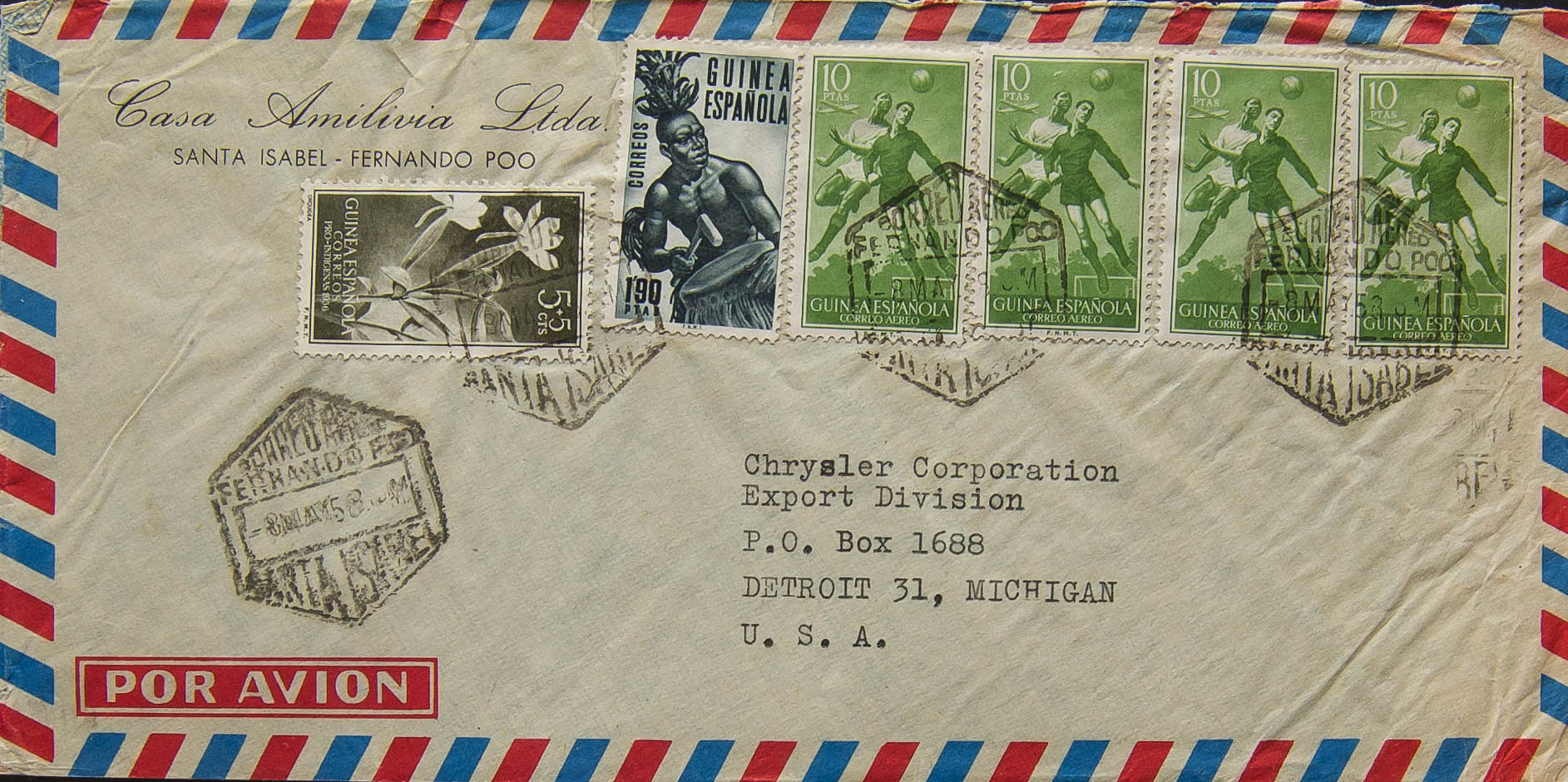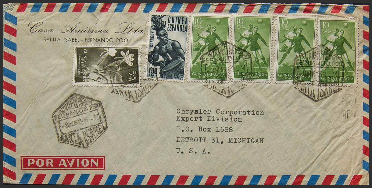 354(4), 358, 329. 1958. 10 sts green, four stamps, 5 cts + 5 olive cts and 1´90 slate sts. SANTA ISABEL to DETROIT (USA). MAGNIFICENT.