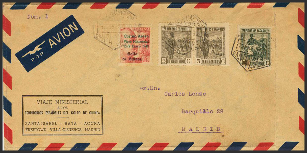 272A. 1948. 4 rose pts, 5 gray chestnut cts, two stamps and 40 greenish gray cts. SANTA ISABEL to MADRID. MINISTERIAL TRIP letterhead on the front and arrival on the back. MAGNIFICENT.