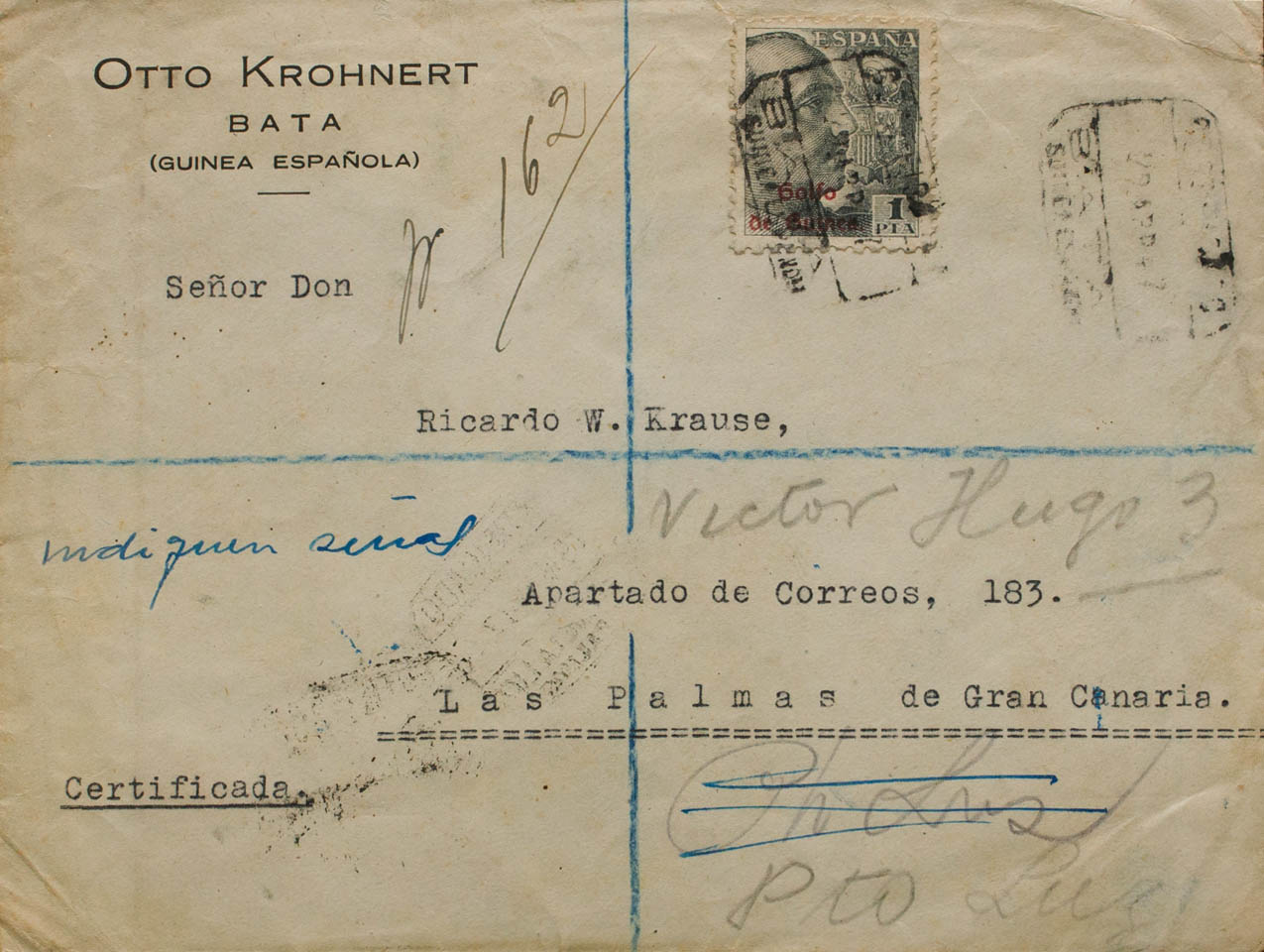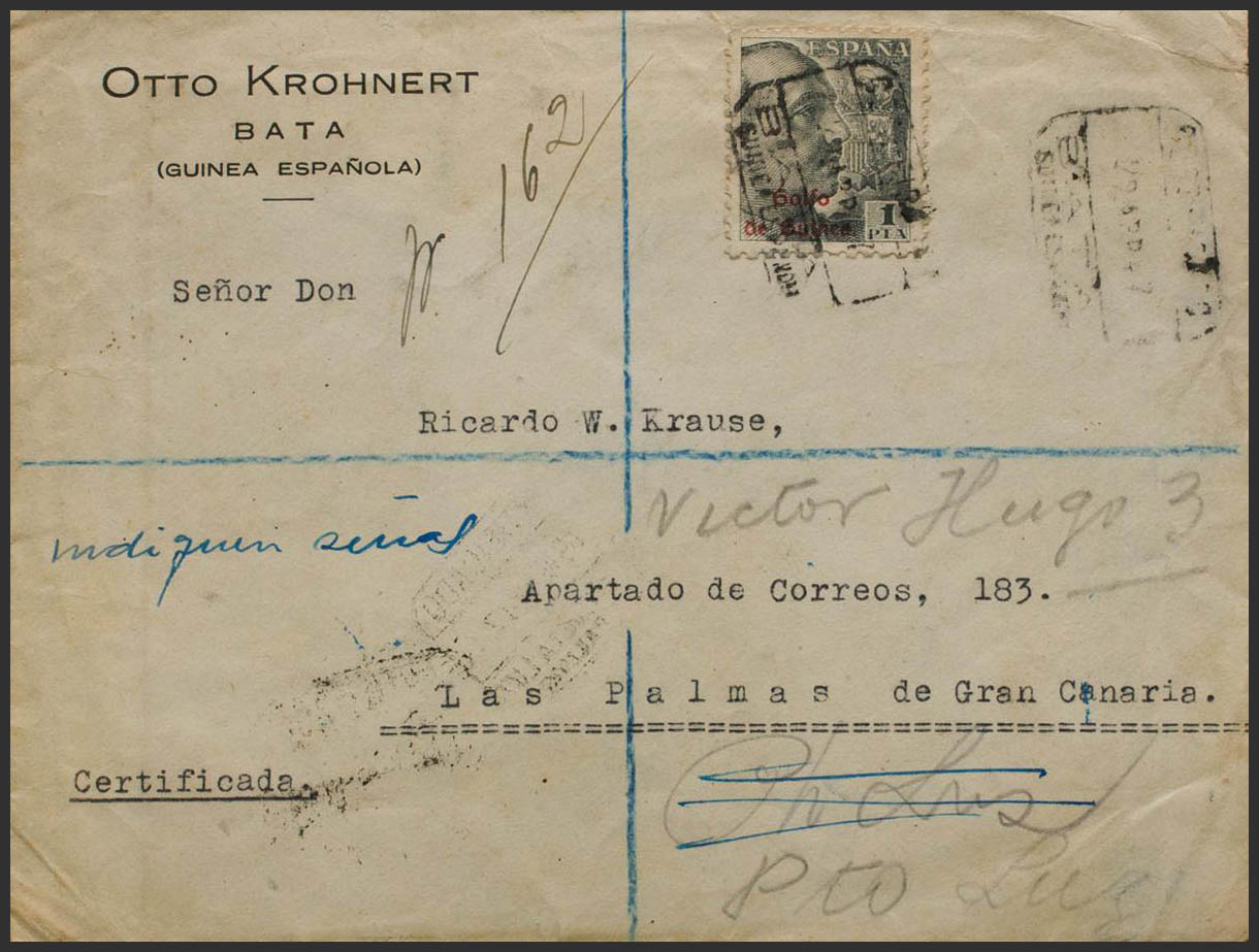 English 269. 1947. 1 black pts. Certificate from BATA (GUINEA) to LAS PALMAS, forwarded to PUERTO DE LA LUZ. On the back arrival. MAGNIFICENT.