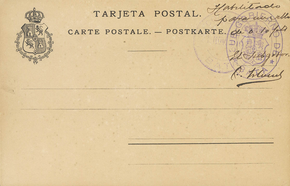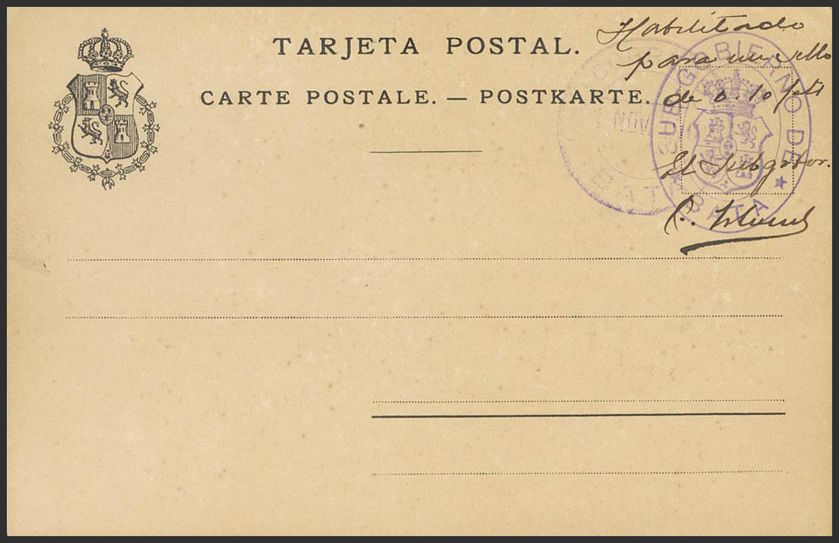 1902. Provisional Postal Card with handwritten indication "Enabled for a stamp of 0'10 pts" with SUBGOVERNMENT OF / BATA mark and CORREOS / BATA dater. MAGNIFICENT AND RARE.
