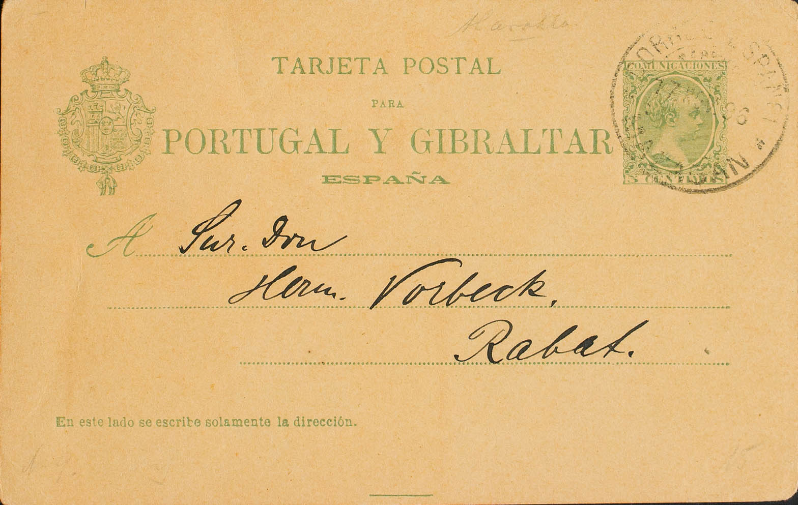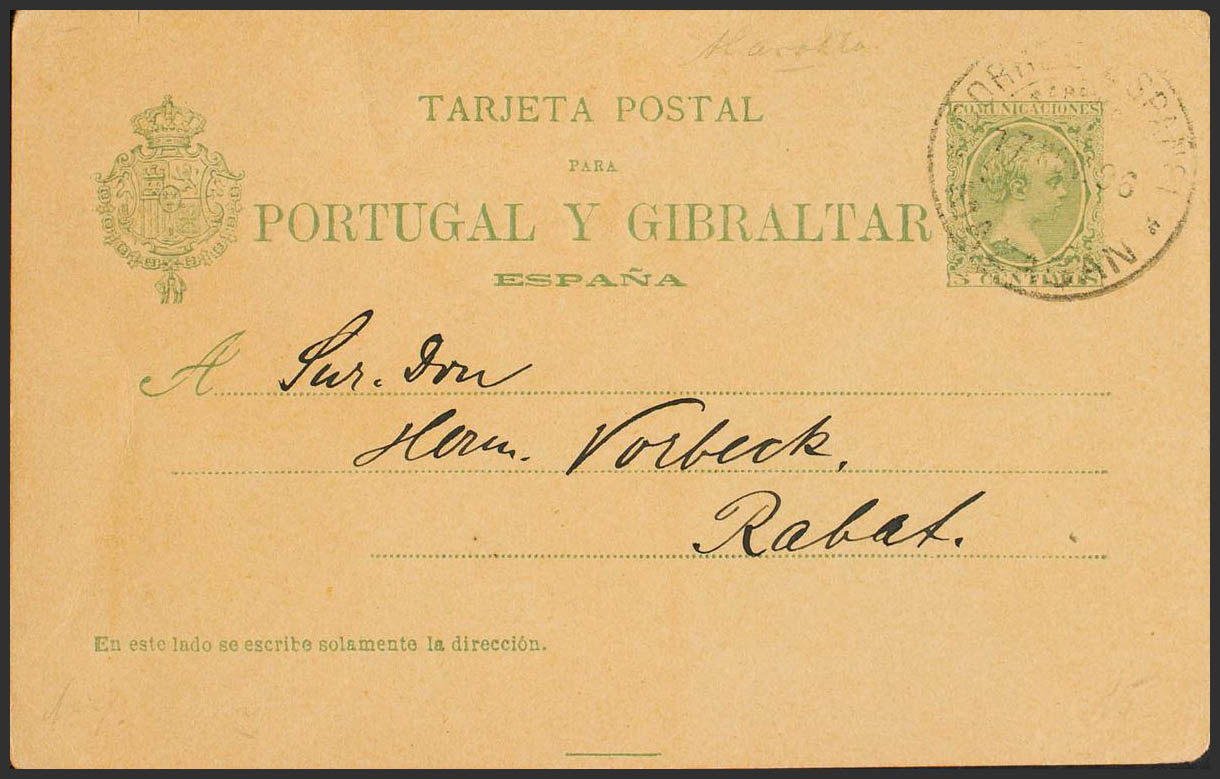 EP34. 1896. 5 cts green on Entire Post Card from MAZAGAN (MOROCCO) to RABAT. Postmark SPANISH POSTMARK / MAZAGAN. MAGNIFICENT AND VERY RARE USE OF A SPANISH INTEGER IN MOROCCO, ESPECIALLY IN A CITY OTHER THAN TANGIER.
