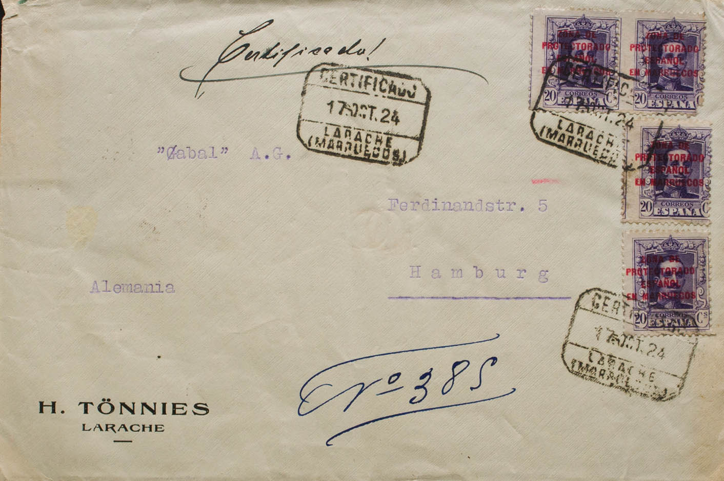 85(4). 1924. 20 violet cts, pair and two stamps. LARACHE (MOROCCO) to HAMBURG (GERMANY). On the back transit and arrival. MAGNIFICENT AND RARE.