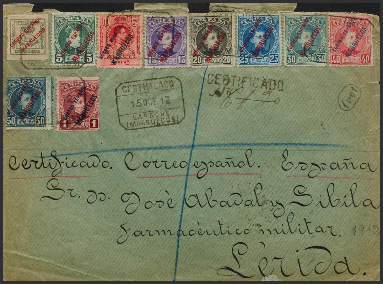 1, 3/11, Tangier 3. 1912. ¼ cts, 5 cts, 15 cts, 20 cts, 25 cts, 30 cts, 40 cts, 50 cts, 1 pts and 10 cts of Medallion. Front of Certificate from LARACHE to LERIDA. MAGNIFICENT AND RARE AND SPECTACULAR POSTAGE.