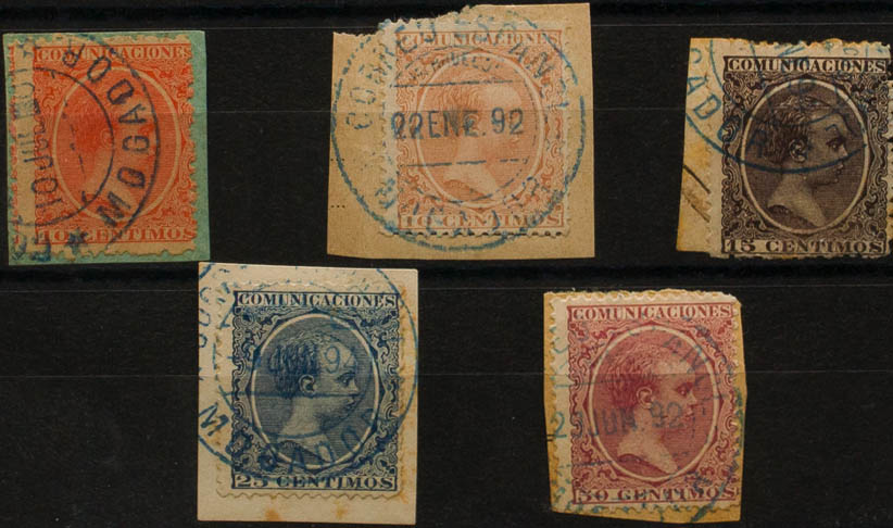 Spain 217/19, 221, 224. 1879. Set of 10 cts chestnut, 10 cts vermilion, 15 cts chestnut purple, 25 cts blue and 50 cts carmine, on fragments, all unused with POSTMARK SPANISH / MOGADOR, in blue. MAGNIFICENT AND VERY RARE SET.