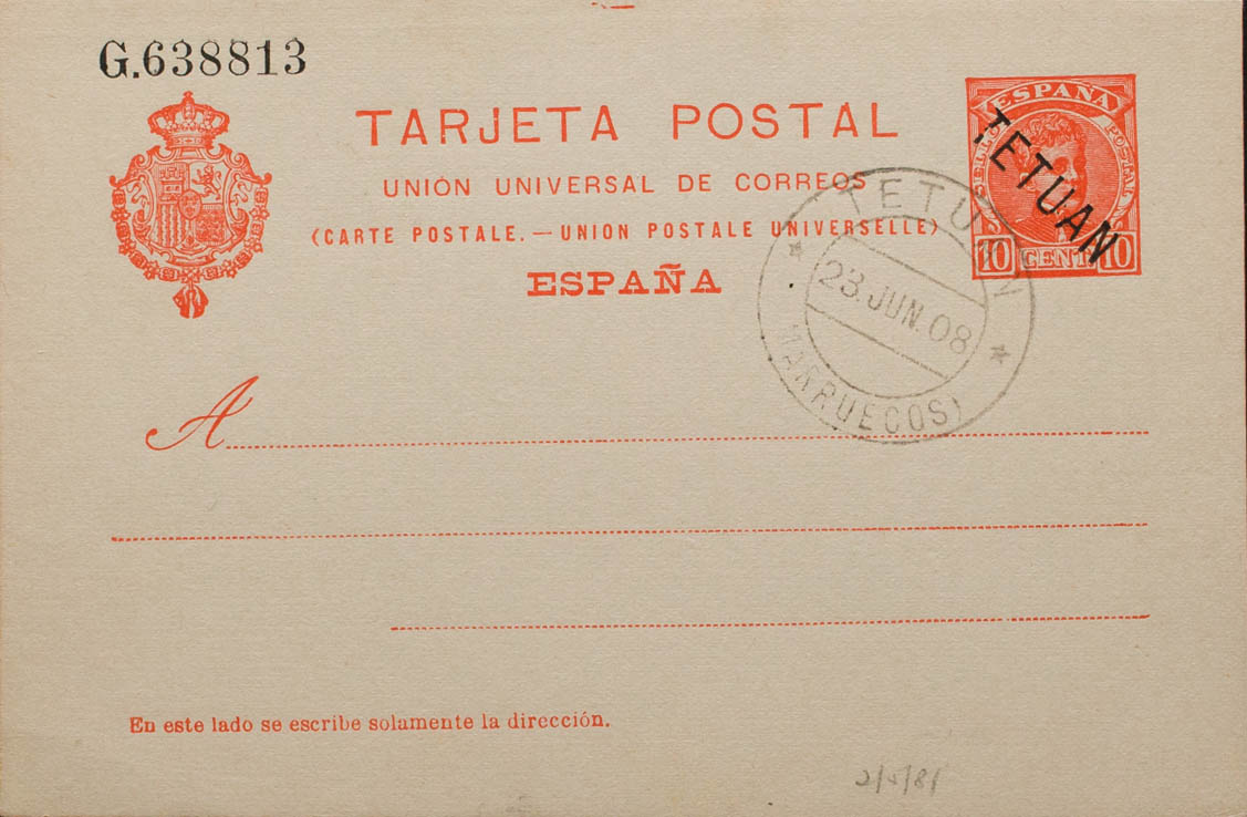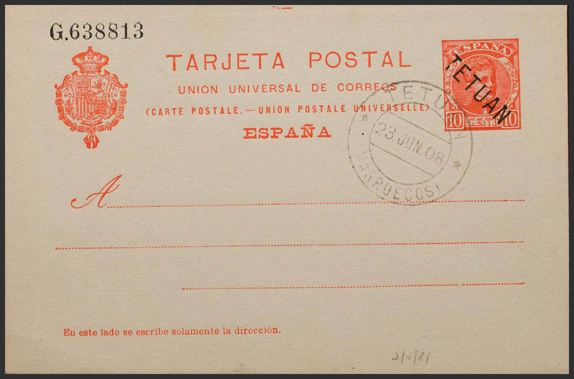 English EP3. 1908. 10 cts red envelope Postal Entire Card. Postmark TETUAN / MOROCCO. MAGNIFICENT AND RARE. Edifil 2018: 310 Euros