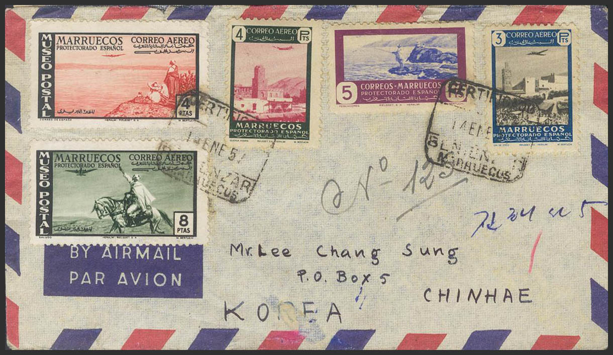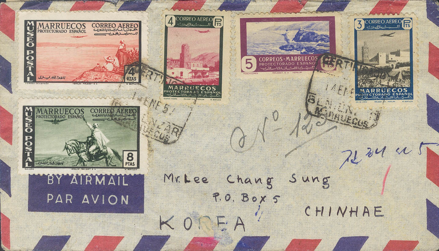358/59, 301/02, 330. 1957. 4 pts black and red, 8 pts black and green and various values. Certificate from BENI-ENZAR to CHINHAE (SOUTH KOREA). On the back transits TOKYO / JAPAN and SEOUL / KOREA, in purple. MAGNIFICENT AND VERY RARE DESTINATION.
