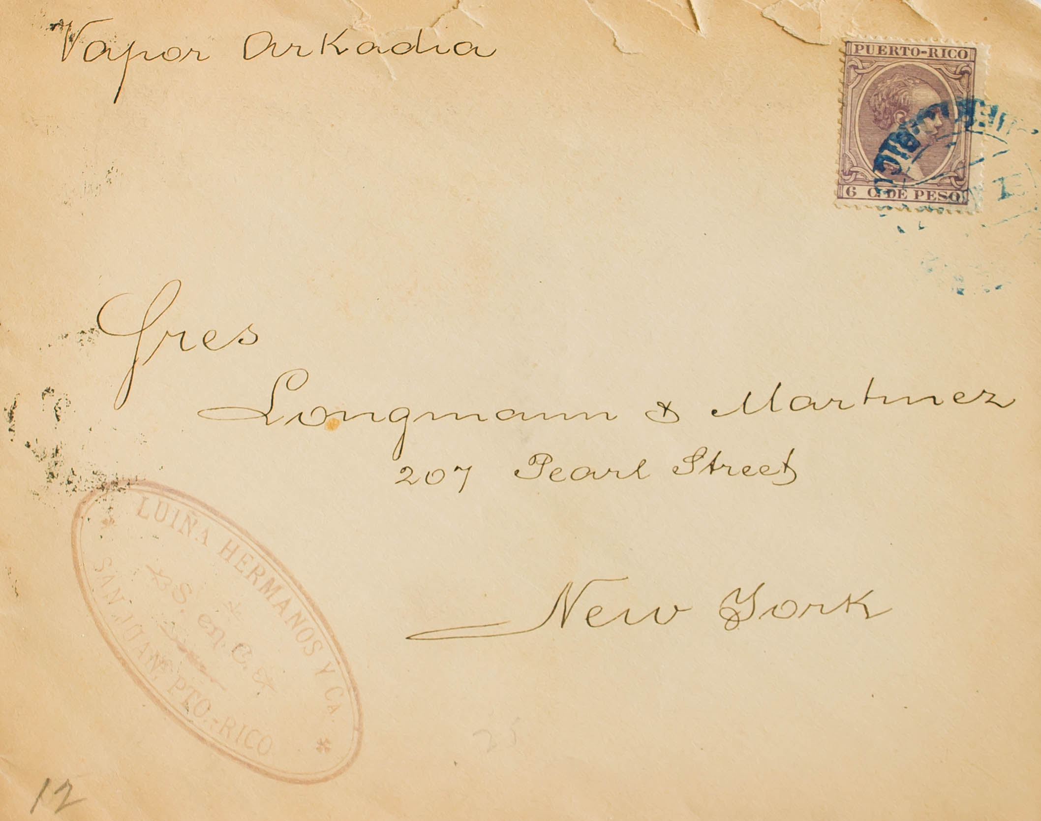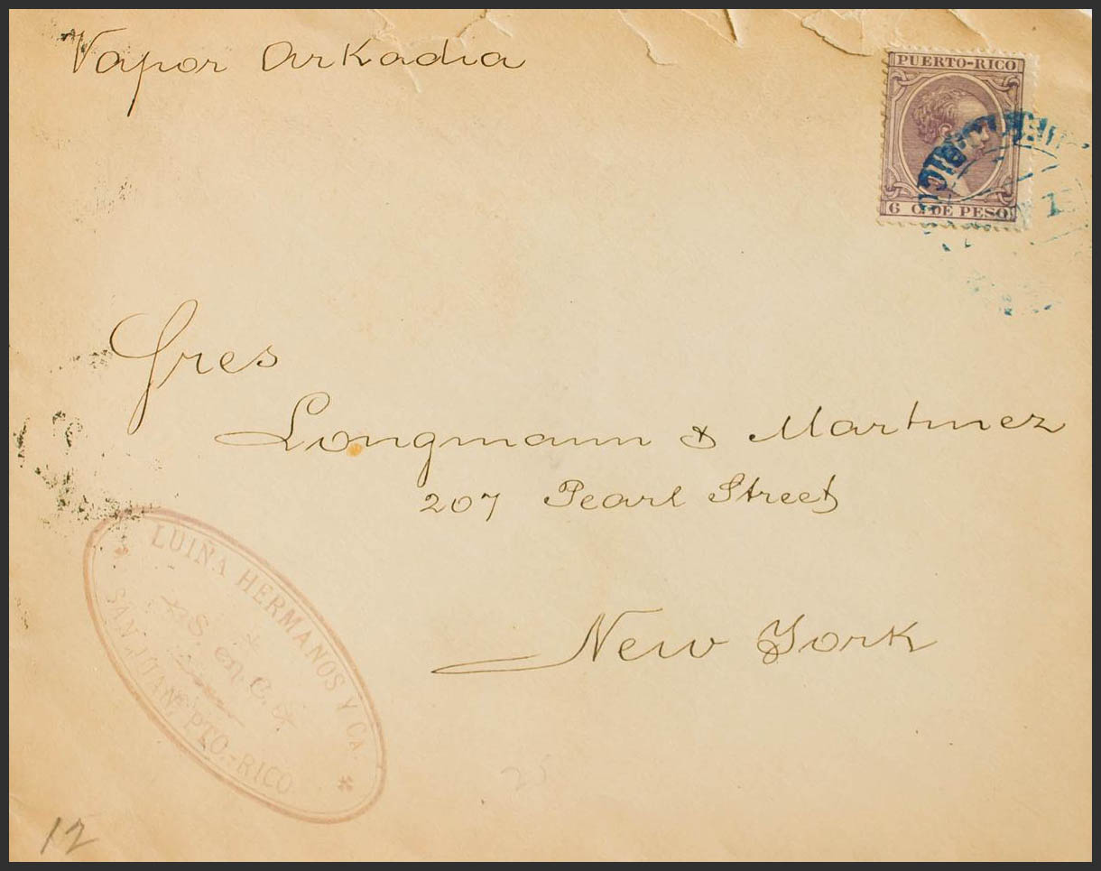 English 125. 1897. 6 cents violet. SAN JUAN to NEW YORK (USA). Postmark ADMON. CENTRAL / PTO. RICO, in blue and "Vapor Arkadia" handwriting, arrival back. MAGNIFICENT.