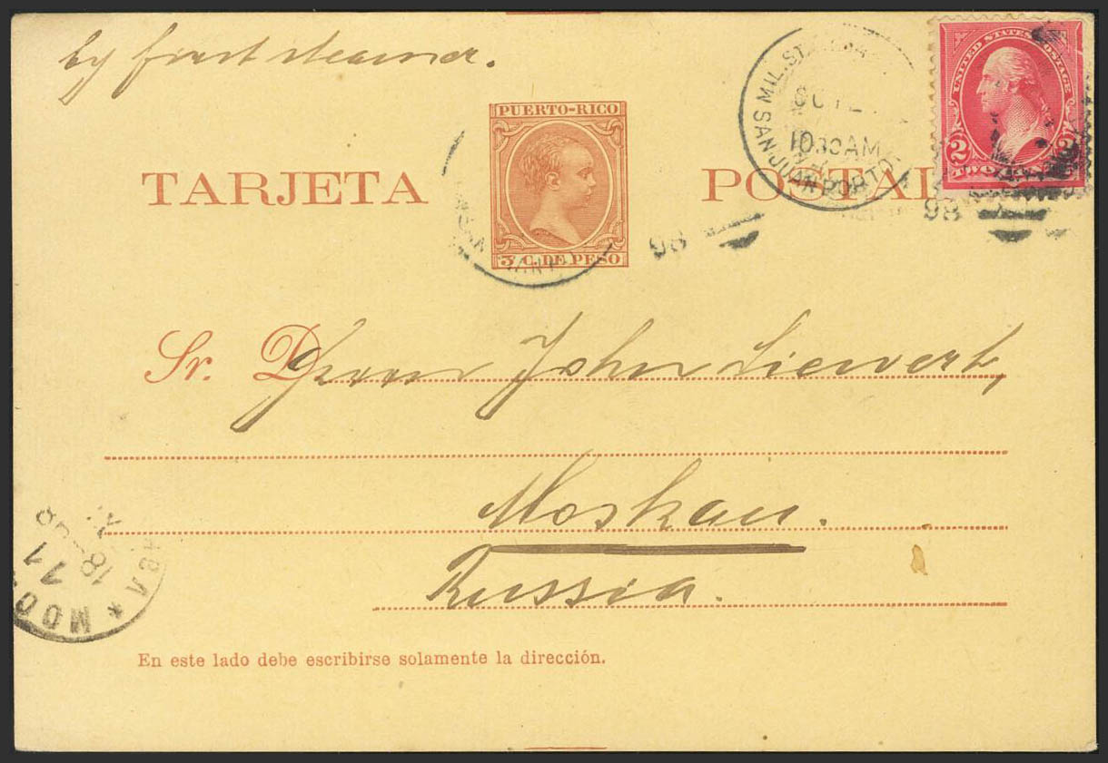 EP8. 1898. 3 cents reddish brown Envelope Post Card from SAN JUAN to MOSCOW (RUSSIA), with additional postage of 2 cents rose from the United States. Duplex postmark MIL.STA. / SAN JUAN-PORTO RICO, on the front and arrival on the back. MAGNIFICENT AND EXTRAORDINARILY RARE CIRCUMSTANTIAL POSTAGE PUERTO RICO-UNITED STATES, ANGEL LAIZ IN HIS POSTAL STATIONERY WORK DOES NOT CATALOG ANY MIXED POSTAGE, NOR IN THE LATER SUPPLEMENT, PROBABLY THE ONLY KNOWN.