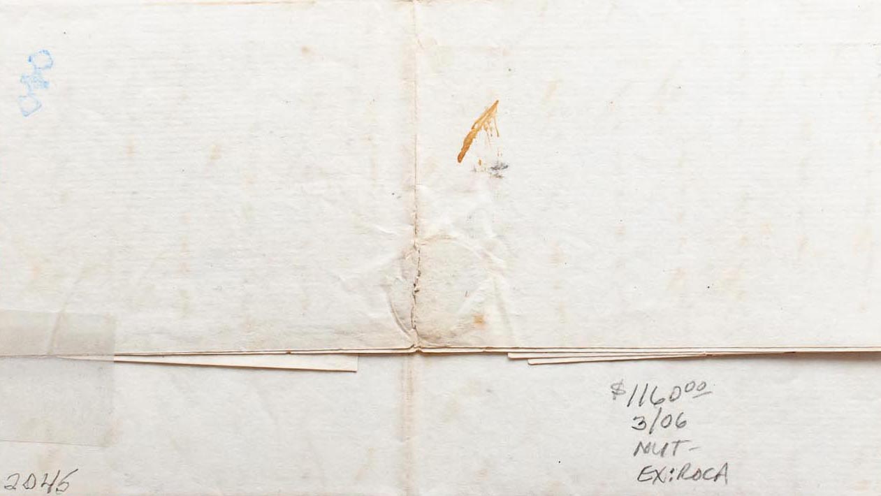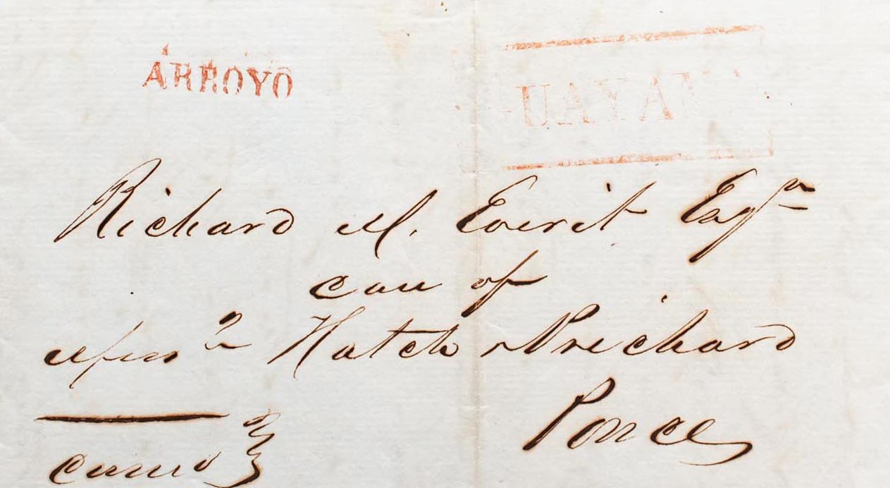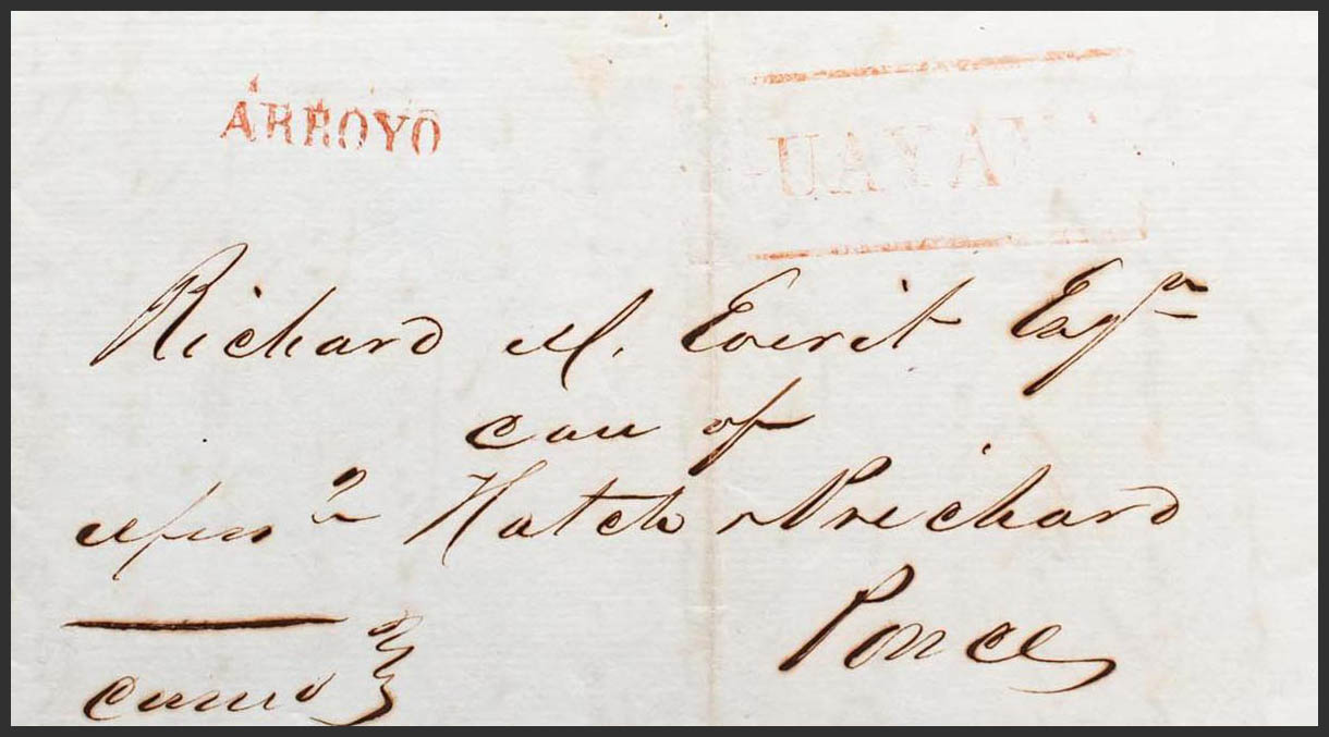 1848. GUAYAMA to PONCE. GUAYAMA marks, in red (PE2) 2004 edition and ARROYO, in red applied in transit (PE1). MAGNIFICENT AND EXTRAORDINARY RARE, NO MORE THAN TWO KNOWN. Ex-Acevedo and Roca (your estimate $1000-1500)